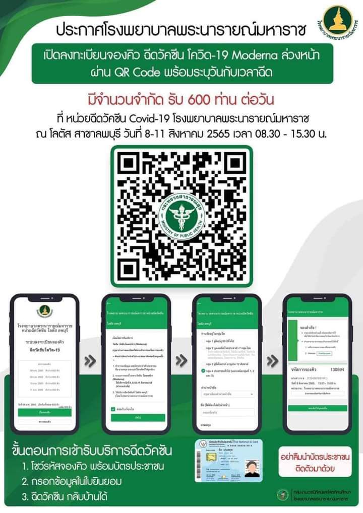 รพ.พระนารายณ์มหาราช เปิดจองคิวฉีดวัคซีน Moderna ล่วงหน้าผ่าน QR Code ตั้งแต่บัดนี้ โดยจะจัดฉีด 8-11 ส.ค. 65 ที่โลตัสสาขาลพบุรี 8.30-15.30 น.