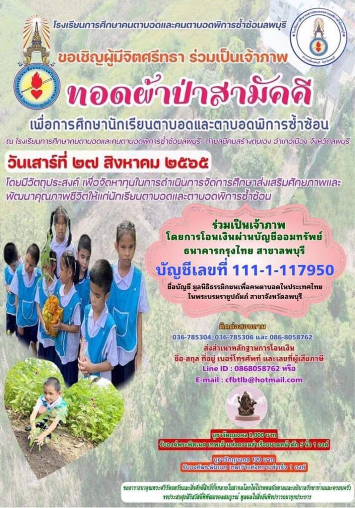 จะมีการทอดผ้าป่าสามัคคี ณ โรงเรียนการศึกษาคนตาบอดและคนตาบอดพิการซ้ำซ้อนลพบุรี