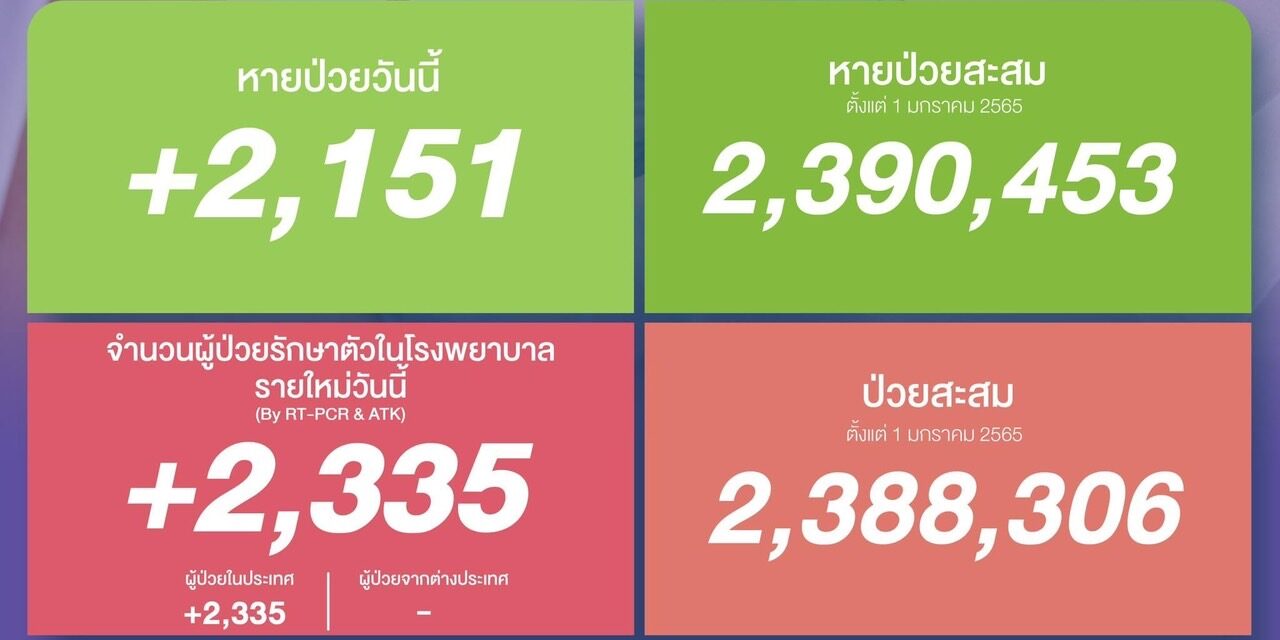 หายป่วยสะสม 2,390,453 ราย (ตั้งแต่ 1 มกราคม 2565)