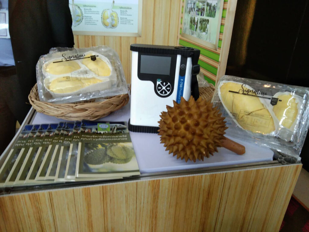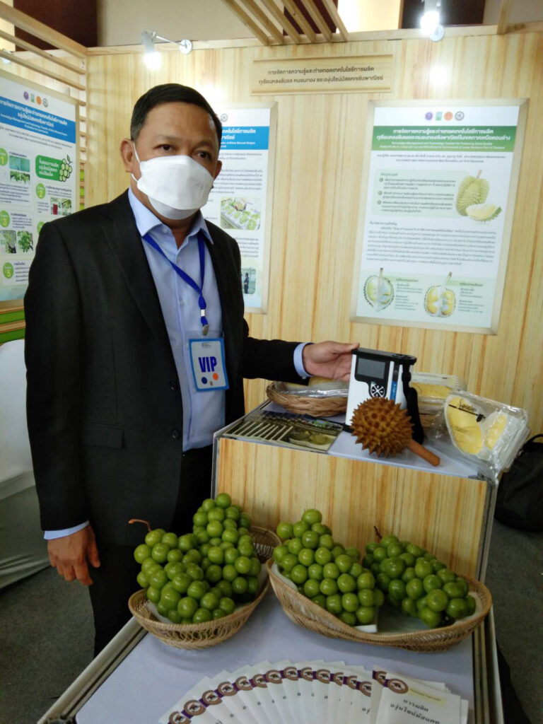 อย่างไรก็ดี ภายในงานมหกรรมงานวิจัยแห่งชาติ 2565 คณะเกษตรศาสตร์ฯ จากมหาวิทยาลัยนเรศวร ยังได้ นำผลงาน “การจัดการความรู้และถ่ายทอดเทคโนโลยีการผลิตทุเรียนหลงลับแลและหมอนทองเชิงพาณิชย์ในเขตภาคเหนือตอนล่าง” ที่ได้รับการสนับสนุนงบประมาณจาก (วช.) มาจัดแสดง ซึ่งนอกจากจะมีการฝึกอบรมเกษตรกรในการเรื่องของเทคโนโลยีการปลูก การดูแลรักษา การแก้ปัญหาแพร่ระบาดของแมลง และการเก็บเกี่ยวผลผลิตแล้ว ยังมีการนำเทคโนโลยีเข้ามาใช้ในการตรวจสอบคุณภาพของผลทุเรียน ทดแทนวิธีการเดิมที่เกษตรกรดูจากสีผิว หนาม และใช้ไม้เคาะ เพื่อประเมินความแก่ของผลทุเรียน โดยเครื่องตรวจสอบความแก่ของผลทุเรียน เป็นเทคโนโลยี NIR (Near Infrared ) ที่นำเข้าจากต่างประเทศ และนำมาพัฒนาเพิ่มเติมในส่วนของสมการที่พัฒนาขึ้นโดยอาศัยการเก็บข้อมูลจริงกว่า 400 ตัวอย่างเพื่อให้การตรวจวัดหาค่าน้ำหนักแห้งในผลทุเรียนที่มีความอ่อน-แก่ในระดับต่างๆ มีความแม่นยำมากขึ้น