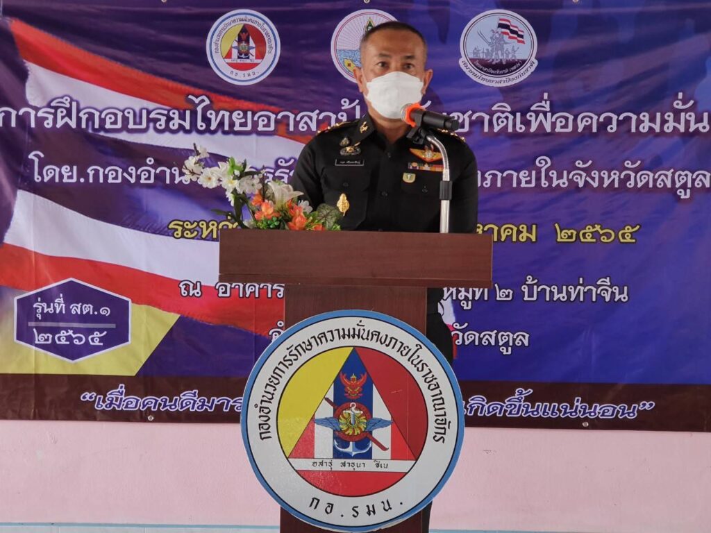 วันนี้ 12 สิงหาคม 2565 พ.อ.กฤศ ศรีเดชาสินธุ์ รองผู้อำนวยการรักษาความมั่นคงภายในจังหวัดสตูล ฝ่ายทหารเป็นประธานในพิธีเปิดการฝึกอบรมสมาชิกไทยอาสาป้องกันชาติ หรือ ทสปช.ประจำปีงบประมาณ 2565โดยมี พ.ต.คนึง มณียม รองหัวหน้าฝ่ายประสานการปฏิบัติ กลุ่มงานประสานความมั่นคงกองอำนวยการรักษาความมั่นคงภายในจังหวัดสตูลกล่าวรายงานตามที่ สำนักงานกิจการมวลชนและสารนิเทศ กองอำนวยการรักษาความมั่นคงภายในราชอาณาจักร ได้มอบหมายให้กองอำนวยการรักษาความมั่นคงภายในจังหวัดสตูลโครงการ ฝึกอบรมไทยอาสาป้องกันชาติเพื่อความมั่นคงจัดอบรมเมื่อวันที่ 8 ถึงวันที่ 10 สิงหาคม 2565 ที่ ผ่านมามีผู้เข้ารับการฝึกอบรมทั้งสิ้น 26 คน ซึ่งผู้เข้ารับการอบรมเป็นสมาชิก ไทยอาสาป้องกันชาติ จังหวัดสตูล จำนวน 7 ตำบล เพื่อนำมวลชนไปจัดตั้งเป็นเครือข่ายและสร้างการมีส่วนร่วมตามกรอบแนวทางของทุนปรัชญาเพื่อความมั่นคง หรือ (ทปค.) และจัดทำแผนปฏิบัติการป้องกันและแก้ไขปัญหาภัยคุกคามด้านความมั่นคงในพื้นที่ระดับตำบลที่ตรงกับสภาพปัญหาที่แท้จริง พร้อมกับประสานหน่วยงานและองค์กรอื่น ในการบูรณาการกับหน่วยงานที่สูงขึ้นในทุกระดับ