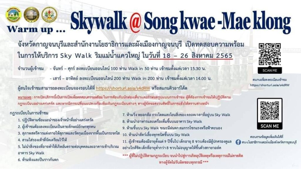 💬 จังหวัดกาญจนบุรีและสำนักงานโยธาธิการและผังเมืองกาญจนบุรี จะเปิดทดสอบความพร้อมการให้บริการ สกายวอร์ค ริมแม่น้ำแควใหญ่ ในระหว่างวันที่ 18-26 สิงหาคม 2565