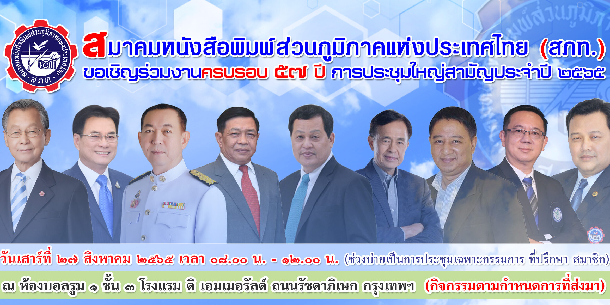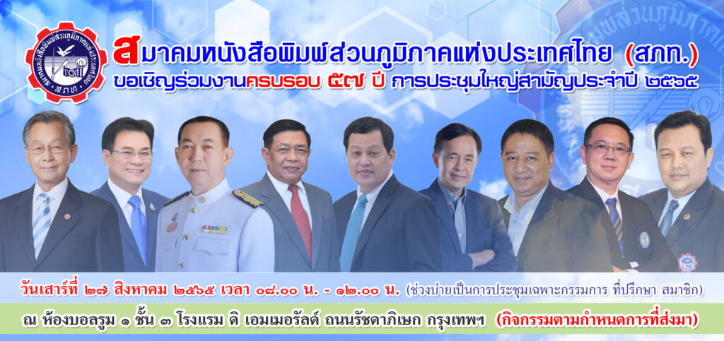 วันอังคารที่ 16 สิงหาคม 2565 ที่ สมาคมหนังสือพิมพ์ส่วนภูมิภาคแห่งประเทศไทย (สภท. 57 ปี ) นายอนันต์ นิลมานนท์ นายกสมาคมหนังสือพิมพ์ส่วนภูมิภาคแห่งประเทศไทย (สภท. 57 ปี ) เปิดเผยว่า สมาคมหนังสือพิมพ์ส่วนภูมิภาคแห่งประเทศไทย (สภท. 57 ปี ) ได้กำหนดให้มีการจัดงานประชุมใหญ่สามัญประจำปี 2565 ในวันเสาร์ที่ 27 สิงหาคม พ.ศ.2565 ณ โรงแรม ดิ เอมเมอรัลด์ ถนนรัชดาภิเษก กรุงเทพฯ โดยได้เรียนเชิญ นายจุรินทร์ ลักษณวิศิษฏ์ รองนายกรัฐมนตรีและรัฐมนตรีว่าการกระทรวงพาณิชย์ มาเป็นประธานในพิธี พร้อมบรรยายพิเศษให้สมาชิกและแขกผู้มีเกียรติที่มาร่วมงานและมอบโล่รางวัลให้กับองค์กรและบริษัทดีเด่น
