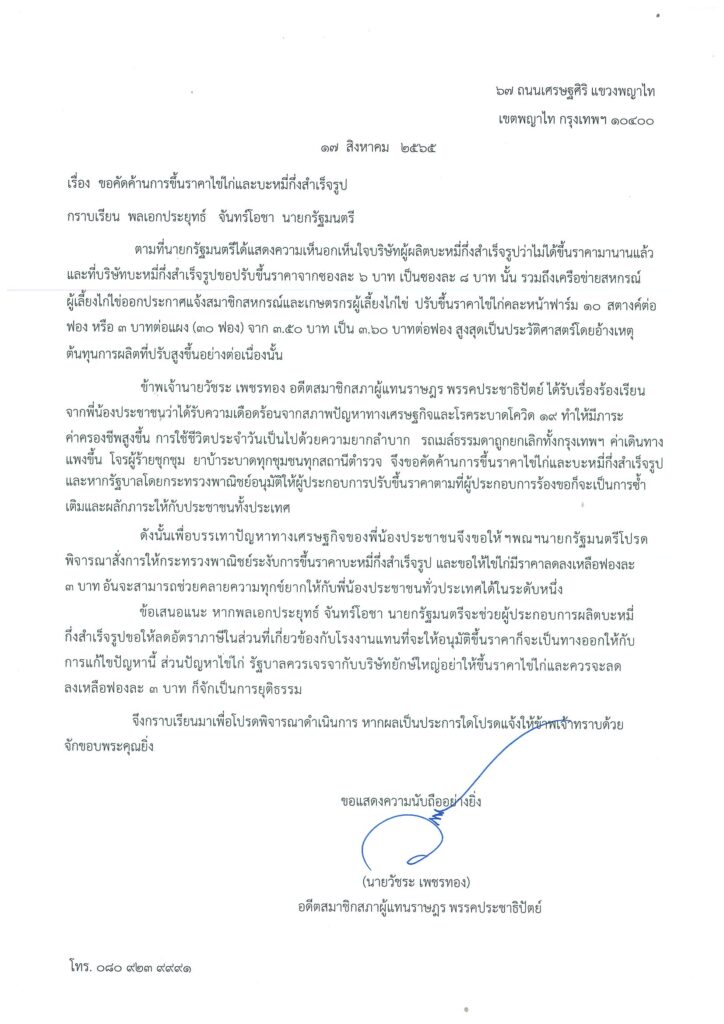 ผ่านนายพันศักดิ์ เจริญ ผู้เชี่ยวชาญมวลชน สำนักปลัดนายกรัฐมนตรี พร้อมนำบะหมี่กึ่งสำเร็จรูปหลายยี่ห้อจำนวน 30 ซองให้พลเอกประยุทธ์ จันทร์โอชา นายกรัฐมนตรี โดยขอให้พิจารณาระงับการขึ้นราคาบะหมี่กึ่งสำเร็จรูปจากซองละ 6 บาทเป็น 8 บาท และไข่ไก่ที่จะขึ้นราคาอีกฟองละ 10สตางค์โดยนายกรัฐมนตรีได้แสดงความเห็นอกเห็นใจบริษัทผู้ผลิตบะหมี่กึ่งสำเร็จรูปว่าไม่ได้ขึ้นราคามานานแล้ว รวมถึงเครือข่ายสหกรณ์ผู้เลี้ยงไก่ไข่ออกประกาศแจ้งสมาชิกและเกษตรกรผู้เลี้ยงไก่ไข่ปรับขึ้นราคาไข่ไก่คละหน้าฟาร์ม 10 สตางค์ต่อฟอง หรือ 3 บาทต่อแผง (30ฟอง) จาก 3.50 บาท เป็น 3.60 บาทต่อฟอง สูงสุดเป็นประวัติศาสตร์ โดยอ้างเหตุต้นทุนการผลิตที่ปรับสูงขึ้นอย่างต่อเนื่องนั้น