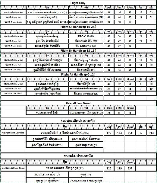 Overall Low Gross ได้แก่ พ.ต.ท.ธเนศ ศรีจำปา ทีม รศ.ดร.คมเพชร ฉัตรศุภกุล