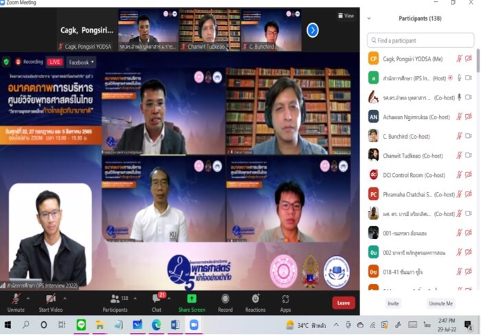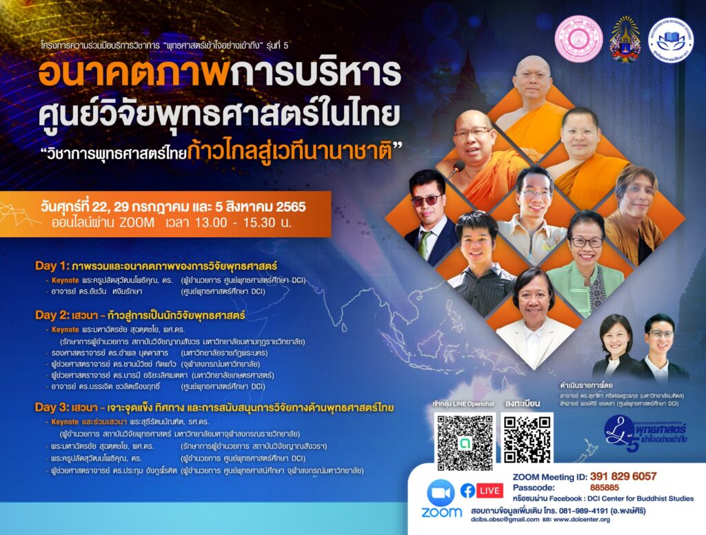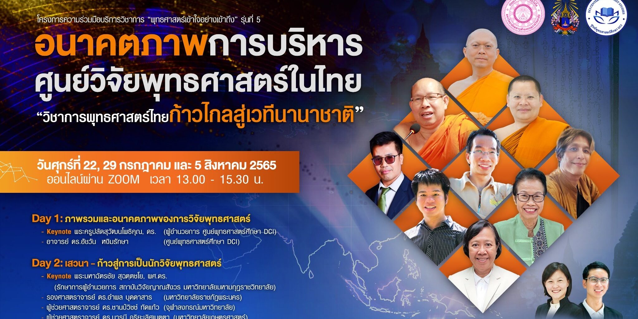 วันที่ 18 สิงหาคม 2565 พระครูสมุห์สนิทวงศ์ วุฑฺฒิวํโส ผู้อำนวยการสำนักสื่อสารองค์กร วัดพระธรรมกาย ตำบลคลองสาม อำเภอคลองหลวง จังหวัดปทุมธานี ได้เปิดเผยว่า โครงการความร่วมมือบริการวิชาการ “พุทธศาสตร์เข้าใจอย่างเข้าถึง” รุ่นที่ 5 เรื่อง อนาคตภาพการบริหารศูนย์วิจัยพุทธศาสตร์ในไทย วิชาการพุทธศาสตร์ไทยก้าวไกลสู่เวทีนานาชาติ ดำเนินโครงการภายใต้ความร่วมมือจาก 3 สถาบันการศึกษาทางพระพุทธศาสนา คือ 1) สถาบันวิจัยพุทธศาสตร์ มหาวิทยาลัยมหาจุฬาลงกรณราชวิทยาลัย 2) สถาบันวิจัยญาณสังวร มหาวิทยาลัยมหามกุฏราชวิทยาลัย และ 3) ศูนย์พุทธศาสตร์ศึกษา DCI โดยเสวนาทางออนไลน์ผ่าน ZOOM ตั้งแต่วันที่ 22 , 29 กรกฎาคม และ 5 สิงหาคม 2565 ที่ผ่านมา