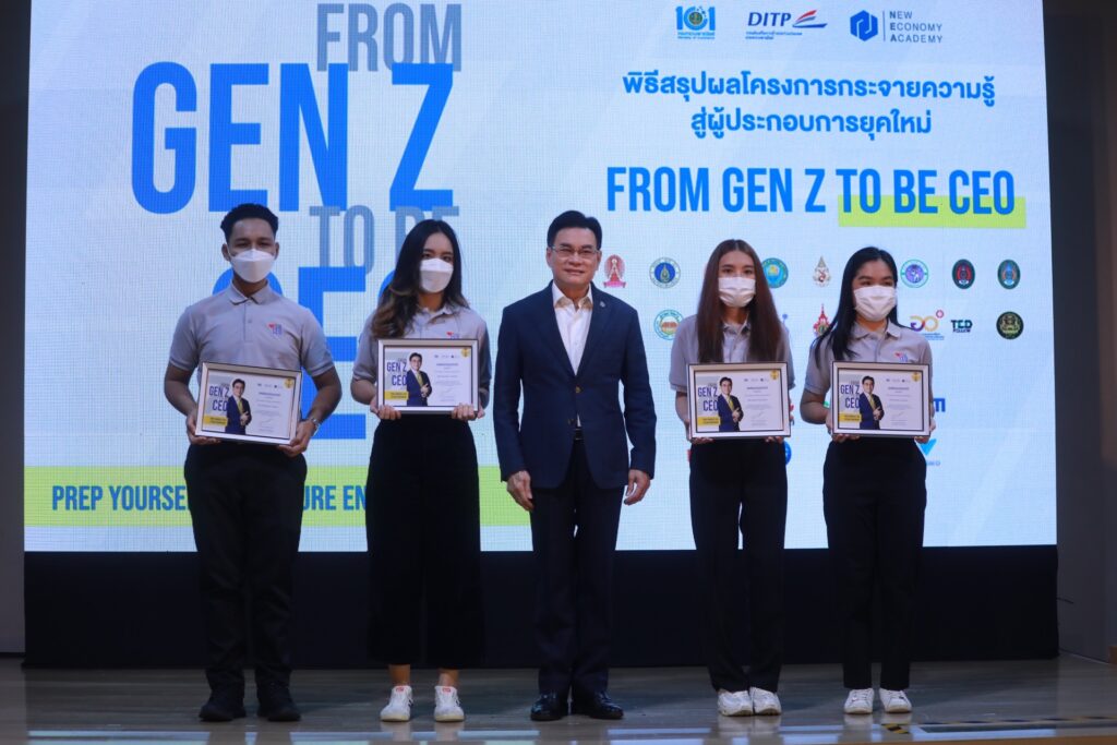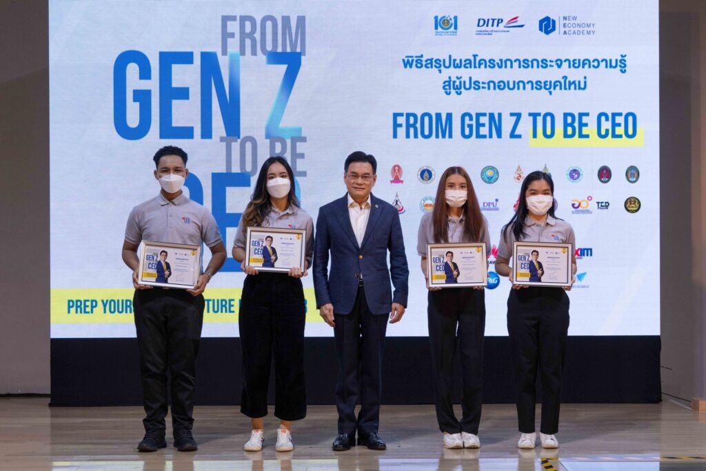 ข้อมูลจากกรมส่งเสริมการค้าระหว่างประเทศระบุว่า โครงการ From Gen Z to be CEO เป็นโครงการที่เกิดขึ้นภายใต้นโยบายของนายจุรินทร์ ลักษณวิศิษฏ์ เพื่อเพิ่มจำนวนผู้ประกอบการให้เกิดขึ้นในระบบเศรษฐกิจ โดยเฉพาะในกลุ่มผู้ประกอบการที่เป็นคนรุ่นใหม่ จัดอบรมหลักสูตรเตรียมความพร้อมสู่การเป็นผู้ประกอบการรุ่นใหม่ โดยมี CEOs และวิทยากรที่มีชื่อเสียงระดับประเทศร่วมถ่ายทอดความรู้และประสบการณ์ และร่วมมือกับ 104 สถาบันชั้นนำทั่วประเทศ และสำหรับผู้ที่ได้คะแนนสูงสุด 500 ลำดับแรก ได้รับสิทธิ์เข้าร่วมกิจกรรม Exclusive Training Program จัดโดย True LAB และ 100 ลำดับแรก ได้รับสิทธิ์ในการพิจารณาเข้าร่วมฝึกงานกับองค์กร ระดับประเทศ ได้แก่ True Huawei Bitkub EXIM Bank Shopee P&G Coro Brothers และสำนักงานส่งเสริมการค้าในต่างประเทศ (สคต.) ที่ตั้งอยู่ในทั่วทุกภูมิภาคทั่วโลก รวมถึงได้สิทธิ์เข้าร่วมกิจกรรมส่งเสริมการค้าระหว่างประเทศ หรือเข้าร่วมโครงการต่างๆ ที่จัดโดยกรมส่งเสริมการค้าระหว่างประเทศและพันธมิตรของโครงการ และภายในงานมีการมอบประกาศนียบัตรให้กับ Gen Z ที่ทำคะแนนสูงสุด 100 ลำดับแรก รางวัลสถาบันการศึกษาดีเด่นและบุคลากรดีเด่น และมอบรางวัล Gen Z Ambassadors สำหรับผู้ที่ทำคะแนนสูงสุด 4 รายจากผู้เข้าร่วมโครงการทั้งหมดกว่า 15,847 ราย โดย Gen Z Ambassadors ได้แก่