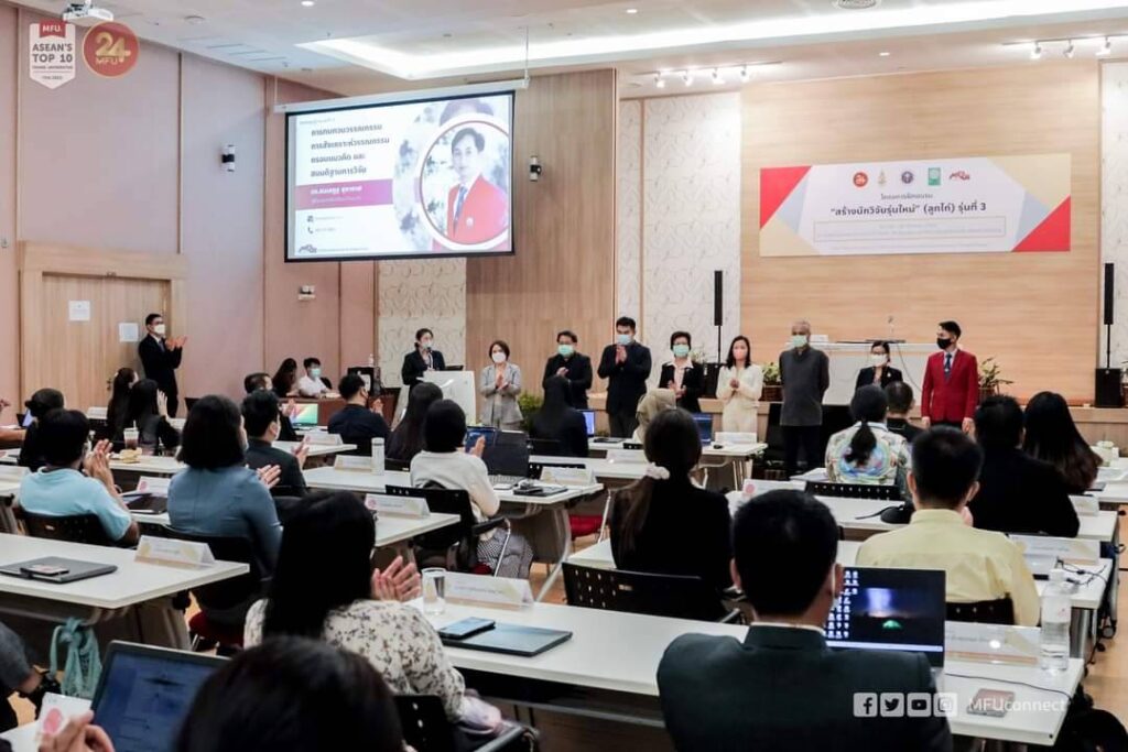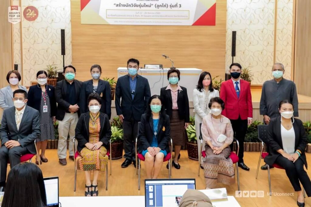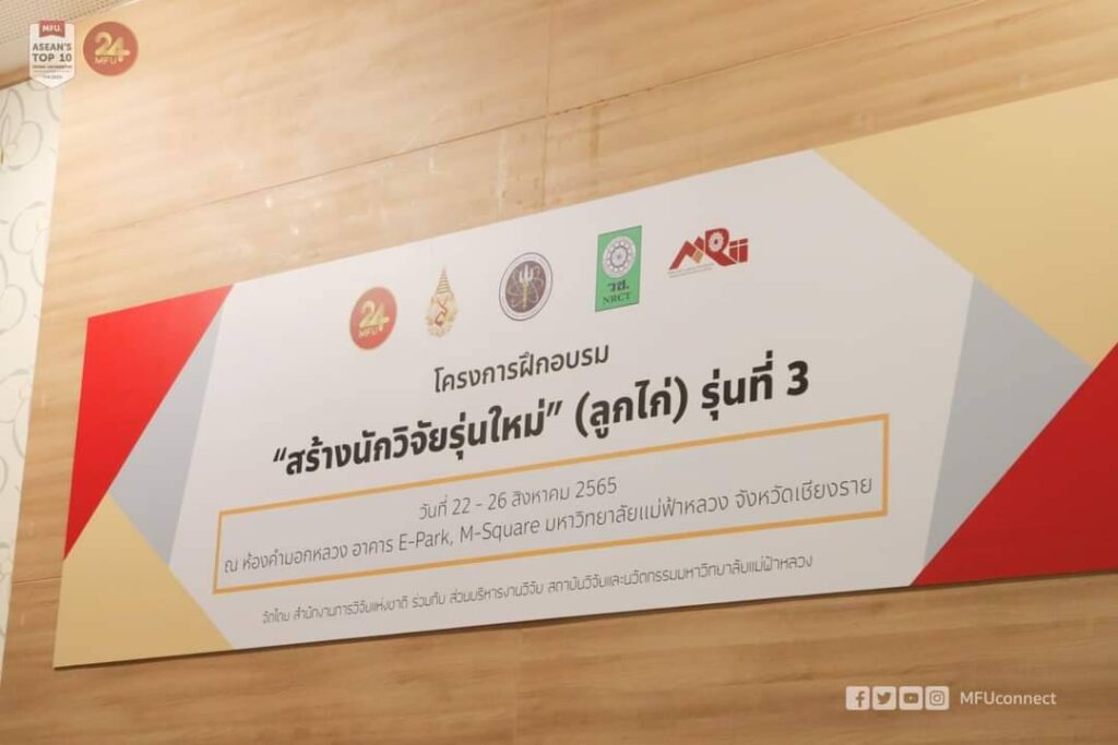 วันที่ 22 สิงหาคม พ.ศ.2565 สำนักงานการวิจัยแห่งชาติ (วช.) ร่วมกับ มหาวิทยาลัยแม่ฟ้าหลวง (มฟล.) จัดโครงการฝึกอบรม “สร้างนักวิจัยรุ่นใหม่” (ลูกไก่) รุ่นที่ 3 ซึ่งจัดขึ้นระหว่างวันที่ 22–26 สิงหาคม 2565 ณ ห้องคำมอกหลวง อาคาร E-Park,M Square มหาวิทยาลัยแม่ฟ้าหลวง จังหวัดเชียงราย โดยได้รับเกียรติจาก ดร.วิภารัตน์ ดีอ่อง ผู้อำนวยการสำนักงานการวิจัยแห่งชาติ เป็นประธานกล่าวเปิดโครงการฯ และศาสตราจารย์ ดร.สุจิตรา วงศ์เกษมจิตต์ รองอธิการบดีมหาวิทยาลัยแม่ฟ้าหลวง กล่าวต้อนรับ