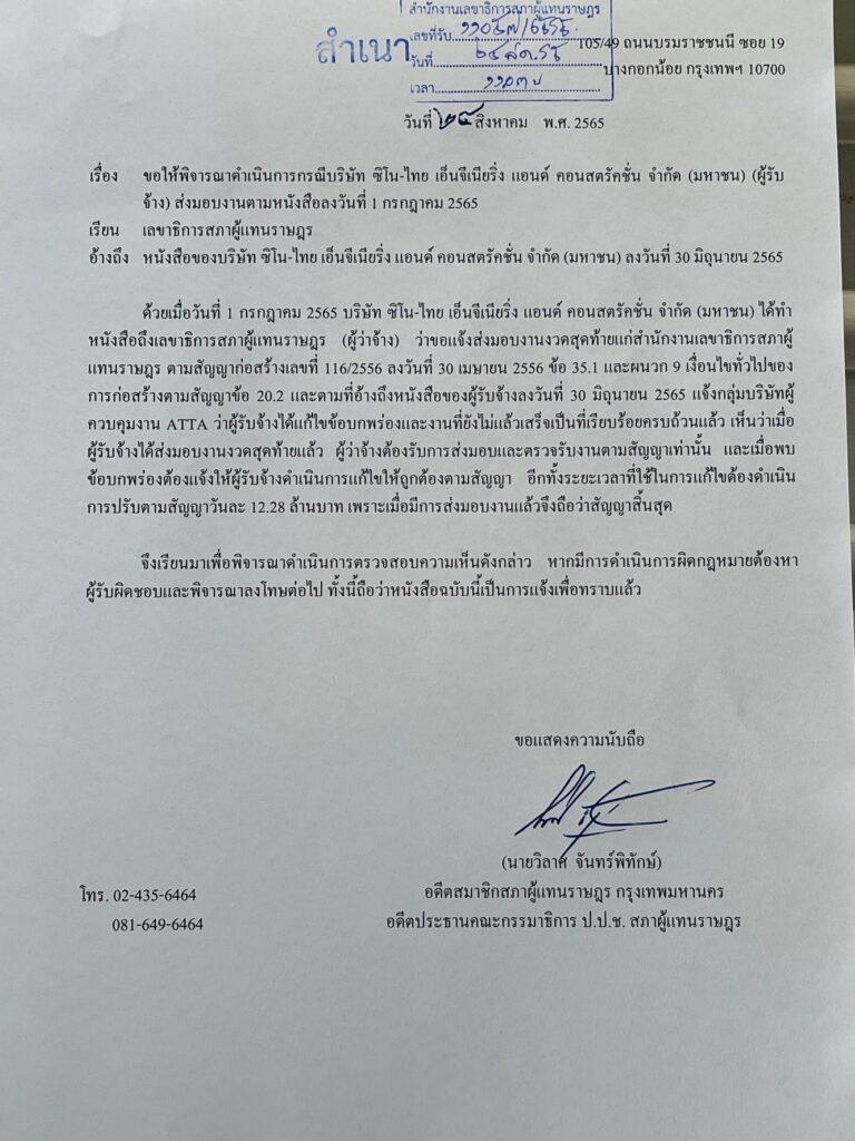(25 ส.ค.65)ที่อาคารรัฐสภา นายวิลาศ จันทร์พิทักษ์ อดีตส.ส.พรรคประชาธิปัตย์ ยื่นหนังสือถึงนางพรพิศ เพชรเจริญ เลขาธิการสภาผู้แทนราษฎร ขอให้ดำเนินการกรณีบริษัท ซิโน-ไทย เอ็นจีเนียริ่ง แอนด์ คอนสตรัคชั่น จำกัด (มหาชน) ผู้รับจ้าง ส่งมอบงานตามหนังสือลงวันที่ 1 กรกฎาคม 2565 เนื่องจากในวันดังกล่าว บริษัท ซิโน-ไทยฯ ได้ทำหนังสือถึงเลขาธิการสภาผู้แทนราษฎร ผู้ว่าจ้าง ว่าขอแจ้งส่งมอบงานงวดสุดท้ายแก่สำนักงานเลขาธิการสภาผู้แทนราษฎร ตามสัญญาก่อสร้างเลขที่ 116/2556 ลงวันที่ 30 เมษายน 2556 ข้อ 35.1 และผนวก 9 เงื่อนไขทั่วไปของการก่อสร้างตามสัญญาข้อ 20.2 และตามที่อ้างถึงหนังสือของผู้รับจ้างลงวันที่ 30 มิถุนายน 2565 แจ้งกลุ่มบริษัทผู้ควบคุมงาน ATTA ว่าผู้รับจ้างได้แก้ไขข้อบกพร่องและงานที่ยังไม่แล้วเสร็จเป็นที่เรียบร้อยครบถ้วนแล้ว จึงเห็นว่าเมื่อผู้รับจ้างได้ส่งมอบงานงวดสุดท้ายแล้ว ผู้ว่าจ้างต้องรับการส่งมอบและตรวจรับงานตามสัญญาเท่านั้น และเมื่อพบข้อบกพร่องต้องแจ้งให้ผู้รับจ้างดำเนินการแก้ไขให้ถูกต้องตามสัญญา อีกทั้งระยะเวลาที่ใช้ในการแก้ไขต้องดำเนินการปรับตามสัญญาวันละ 12.28 ล้านบาท เพราะเมื่อมีการส่งมอบงานแล้วจึงถือว่าสัญญาสิ้นสุด