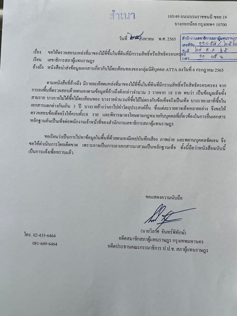 ทั้งนี้ นายวิลาศ ยังได้ยื่นหนังสืออีก 1 ฉบับถึงเลขาธิการสภาผู้แทนราษฎร ขอให้ตรวจสอบแหล่งที่มาของไม้ที่ขึ้นในที่ดินที่มีกรรมสิทธิ์หรือสิทธิครอบครอง จากการลงพื้นที่ตรวจสอบด้วยตนเองตามข้อมูลที่อ้างถึงดังกล่าวจำนวน 3 รายจาก 18 ราย พบว่า เป็นข้อมูลเท็จทั้ง 3 ราย บางรายไม่ได้ซื้อไม้ตะเคียนทอง บางรายมีจำนวนที่ซื้อไม้ไม่ตรงกับข้อเท็จจริงซึ่งเป็นเท็จ บางรายเวลาที่ซื้อในเอกสารแตกต่างกันเกิน 3 ปี และบางรายอ้างว่าเอาไปทำวัตถุประสงค์อื่น ซึ่งแต่ละรายอาจเท็จหลายอย่าง จึงขอให้ตรวจสอบข้อเท็จจริงให้ครบทั้ง18 ราย และพิจารณาลงโทษตามกฎหมายกับบุคคลที่เกี่ยวข้องในการยื่นเอกสารหลักฐานอันเป็นเท็จต่อพนักงานเจ้าหน้าที่ของสำนักงานเลขาธิการสภาผู้แทนราษฎร