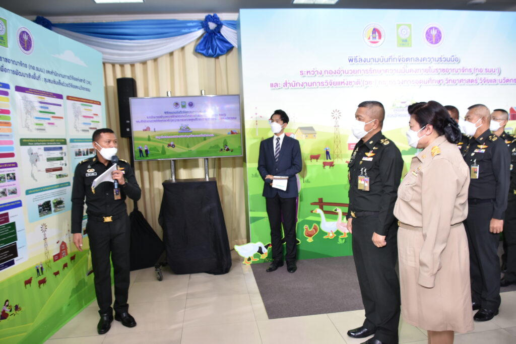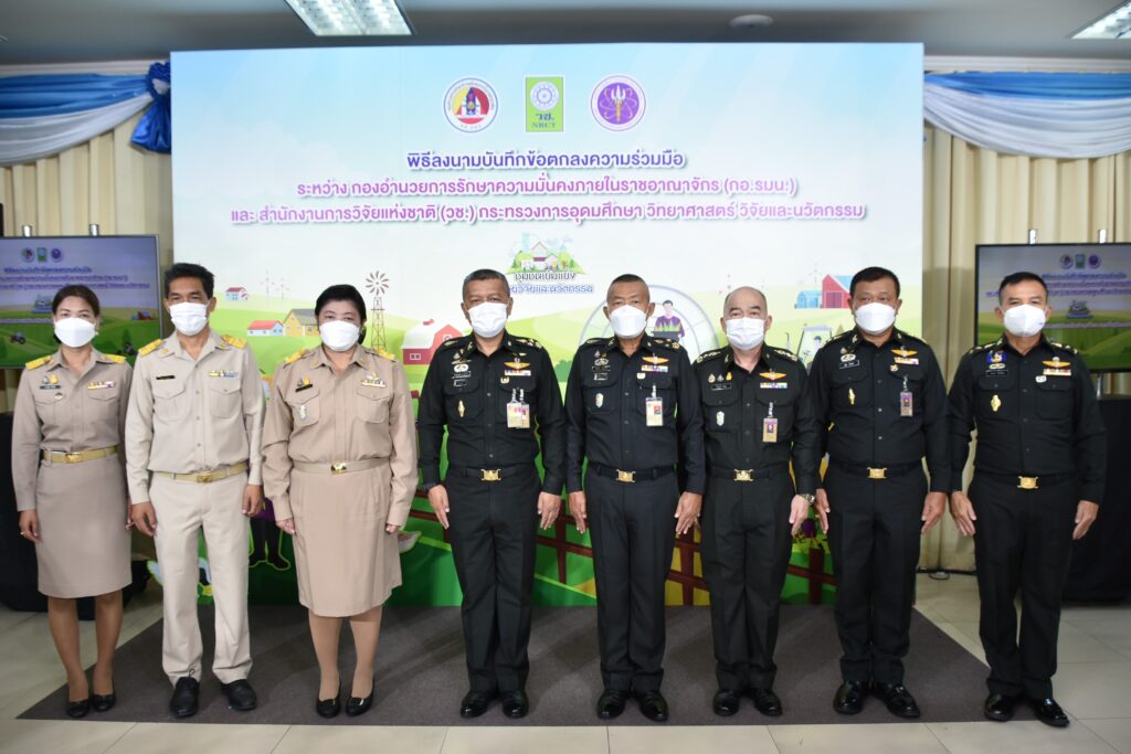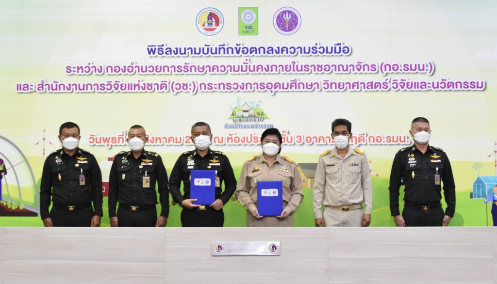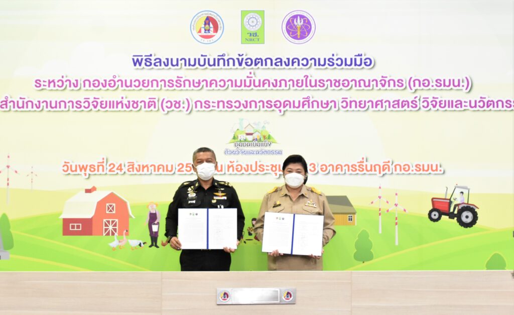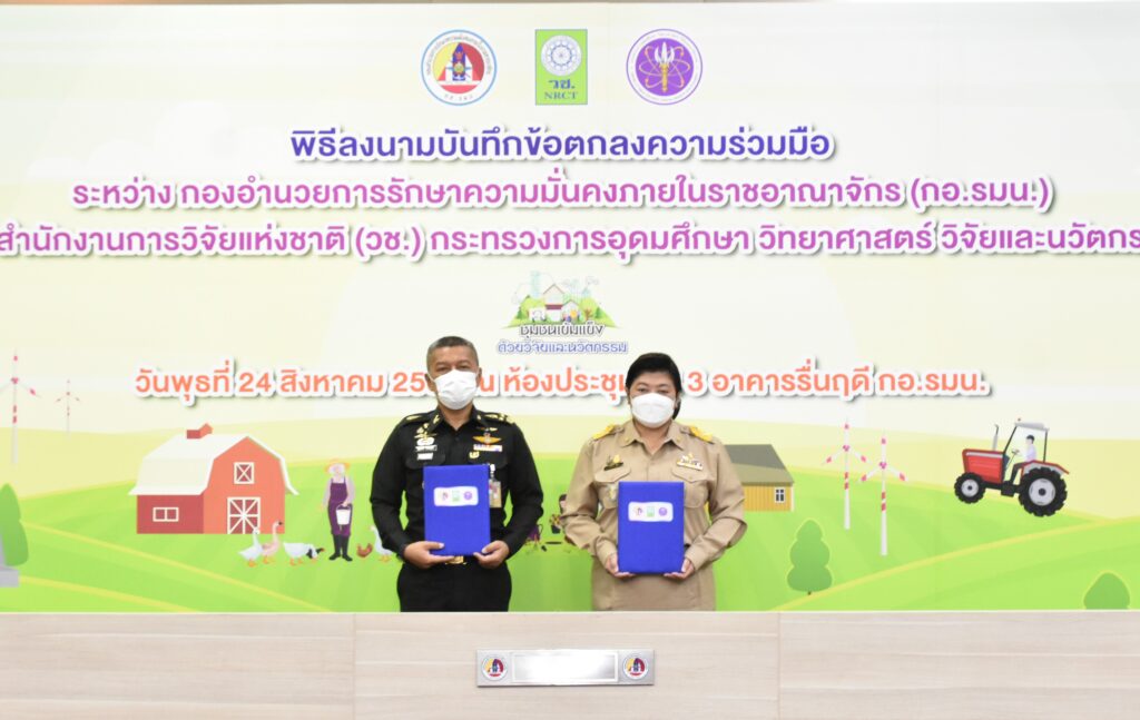 วันที่ 24 สิงหาคม 2565 กองอำนวยการรักษาความมั่นคงภายในราชอาณาจักร (กอ.รมน.) ร่วมกับสำนักงานการวิจัยแห่งชาติ (วช.) กระทรวงการอุดมศึกษา วิทยาศาสตร์ วิจัยและนวัตกรรม (อว.) โดย พลเอก สันติพงศ์ ธรรมปิยะ เลขาธิการกองอำนวยการรักษาความมั่นคงภายในราชอาณาจักร (กอ.รมน.) และ ดร.วิภารัตน์ ดีอ่อง ผู้อำนวยการสำนักงานการวิจัยแห่งชาติ (วช.) ร่วมลงนามบันทึกข้อตกลงความร่วมมือการใช้ประโยชน์องค์ความรู้จากผลงานวิจัยและนวัตกรรม เพื่อการพัฒนาเชิงพื้นที่ : ชุมชนเข้มแข็ง ด้วยวิจัยและนวัตกรรม เพื่อส่งเสริมและสนับสนุนการใช้ประโยชน์ องค์ความรู้จากผลงานวิจัยและนวัตกรรมในการบูรณาการขับเคลื่อนงานวิจัยและนวัตกรรมไปสู่การใช้ประโยชน์เพื่อการพัฒนาชุมชนสังคมในพื้นที่ของ (กอ.รมน.) อันเป็นฐานรากของการพัฒนาเศรษฐกิจโดยรวมของประเทศ ณ อาคารรื่นฤดี (กอ.รมน.) เขตดุสิต กรุงเทพมหานคร
