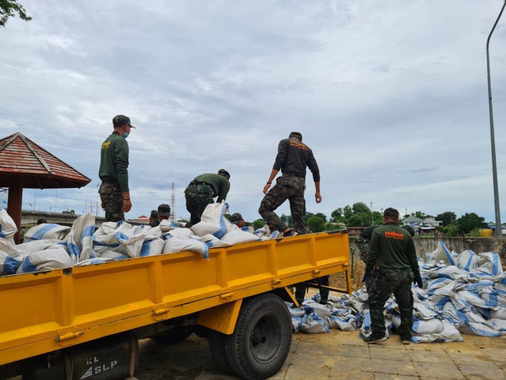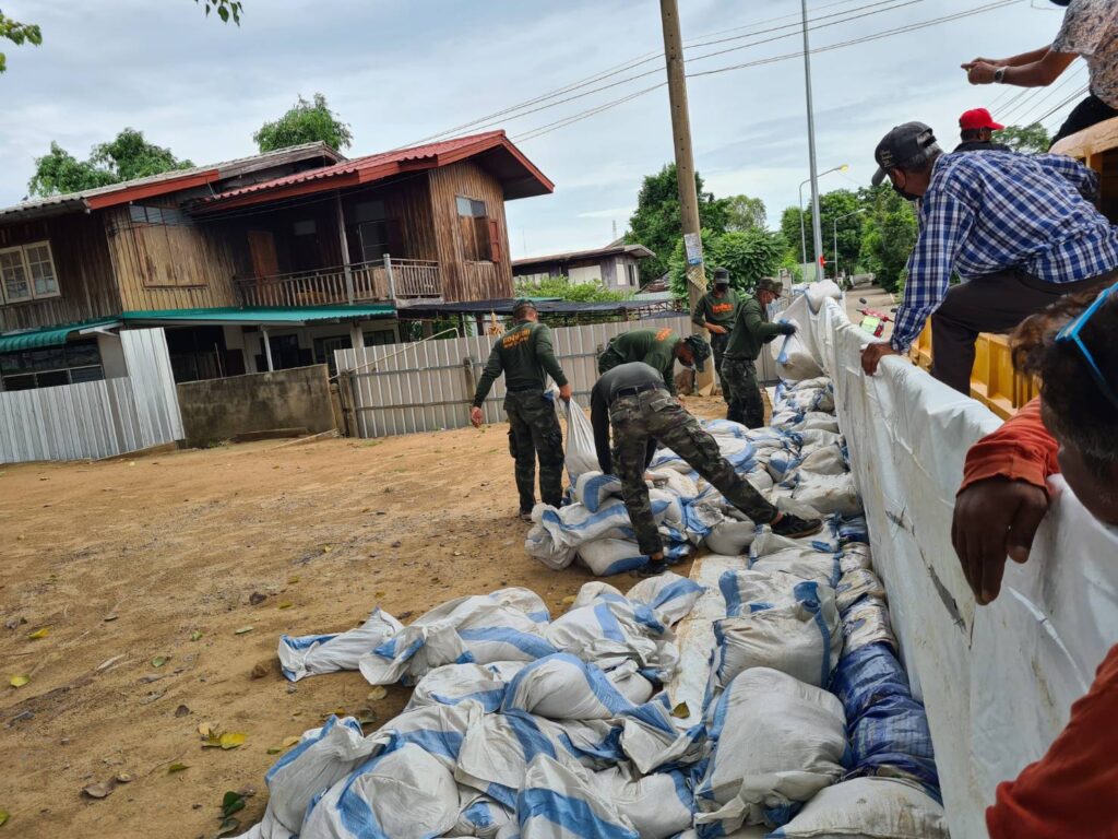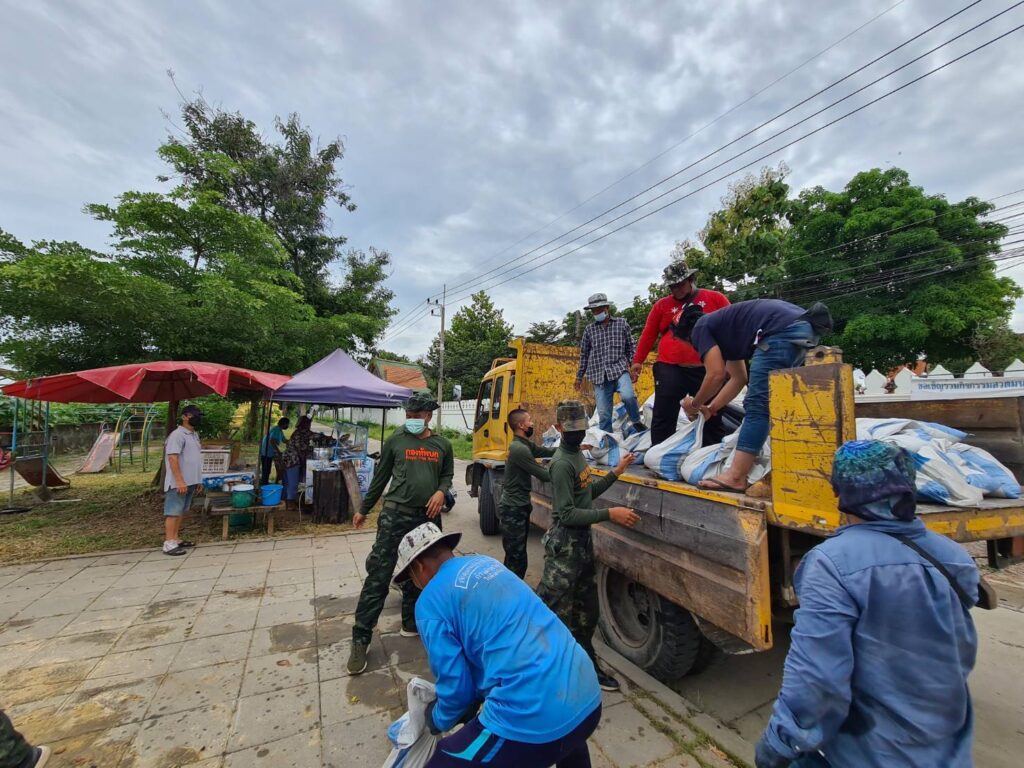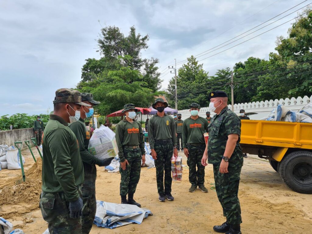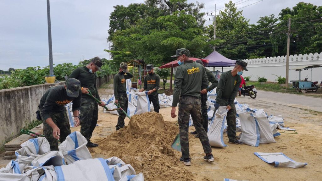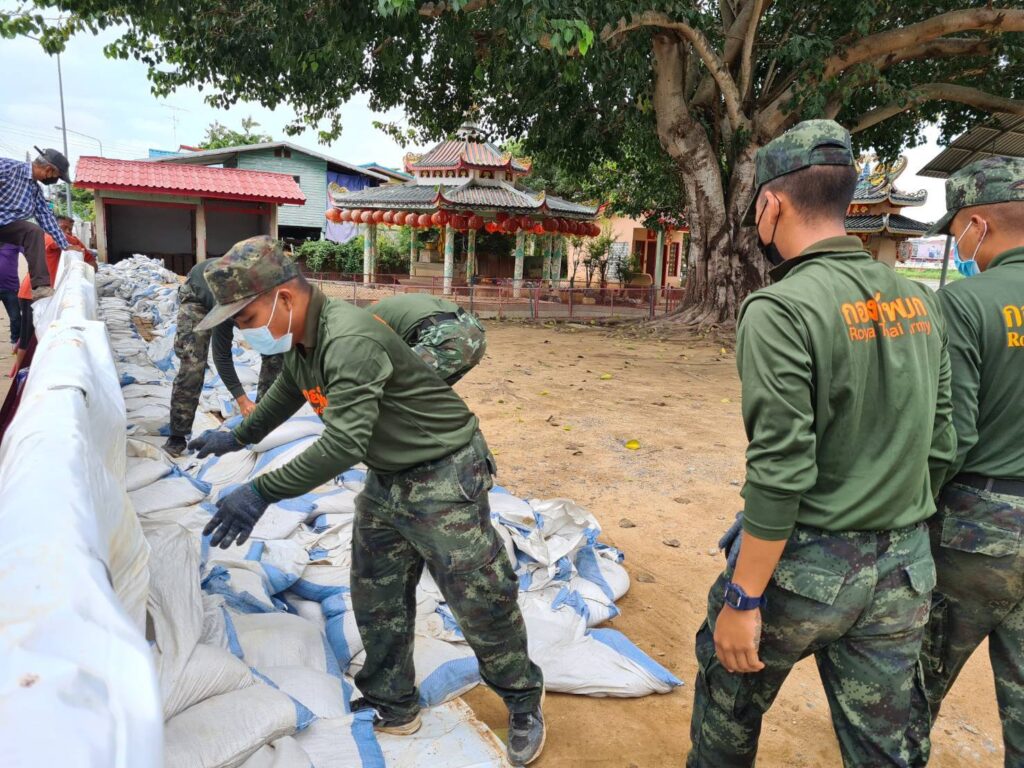 กำลังพลทหาร จำนวน 23 นาย จากกองพลทหารปืนใหญ่ ร่วมกับเจ้าหน้าที่เทศบาลเมืองสิงห์บุรี ร่วมกันบรรจุกระสอบทราย เพื่อนำไปปิดกั้นทับแผ่นซีเมนต์ ป้องกันน้ำเข้าท่วมเทศบาลเมืองสิงห์บุรีฝั่งตะวันออก ที่เป็นช่องว่างของเขื่อน