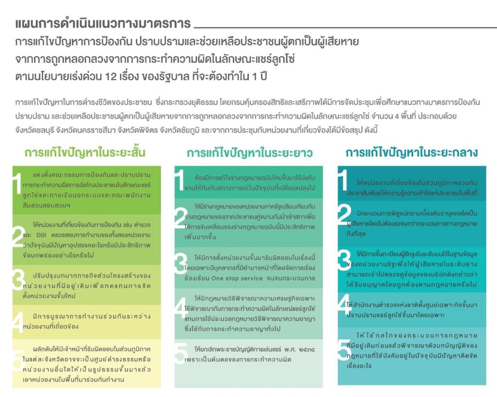 ส่วนแผนการดำเนินแนวทางมาตรการการแก้ไขปัญหาการป้องกัน ปราบปรามและช่วยเหลือประชาชนผู้ตกเป็นผู้เสียหายจากการถูกหลอกลวงจากการกระทำความผิดในลักษณะแชร์ลูกโซ่ตามนโยบายเร่งด่วน 12 เรื่อง ของรัฐบาล ที่จะต้องทำใน 1 ปี การแก้ปัญหาในการดำรงชีวิตของประชาชน ซึ่งกระทรวงยุติธรรม โดยกรมคุ้มครองสิทธิและเสรีภาพได้มีการจัดประชุมเพื่อศึกษาแนวทางมาตรการป้องกัน ปราบปราม และช่วยเหลือประชาชนผู้ตกเป็นผู้เสียหายจากการถูกหลอกลวงจากการกระทำความผิดในลักษณะแชร์ลูกโซ่ จำนวน 4 พื้นที่ มีการแก้ไขปัญหาในระยะสั้น การแก้ไขปัญหาในระยะยาว การแก้ไขปัญหาในระยะกลาง ซึ่งการแก้ไขปัญหาระยะสั้นคือ 1) แต่งตั้งคณะกรรมการป้องกันและปราบปรามการฉ้อโกงประชาชนในลักษณะแชร์ลูกโซ่ และการเงินนอกระบบ และคณะพนักงานสอบสวน 2 ) ให้หน่วยงานที่เกี่ยวข้องกับการป้องกัน เช่น ตำรวจ ดีเอสไอ ตรวจสอบการทำงานของทั้งสองหน่วยงานว่าปัจจุบันมีปัญหาอะไรมีประสิทธิภาพข้อบกพร่องอย่างไร 3 )ปรับปรุงบทบาทภารกิจโครงสร้างของหน่วยงานที่มีอยู่เดิมเพื่อทดแทนการจัดตั้งหน่วยงานขึ้นใหม่ 4 ) มีการบูรณาการการทำงานร่วมกันระหว่างหน่วยงานที่เกี่ยวข้อง 5) ผลักดันให้มีเจ้าหน้าที่รับผิดชอบในส่วนภูมิภาคในแต่ละจังหวัดอาจจะเป็นศูนย์ดำรงค์ธรรมหรือ หน่วยงานอื่นใดให้เป็นรูปธรรมขึ้นมาการแก้ไขปัญหาระยะกลาง