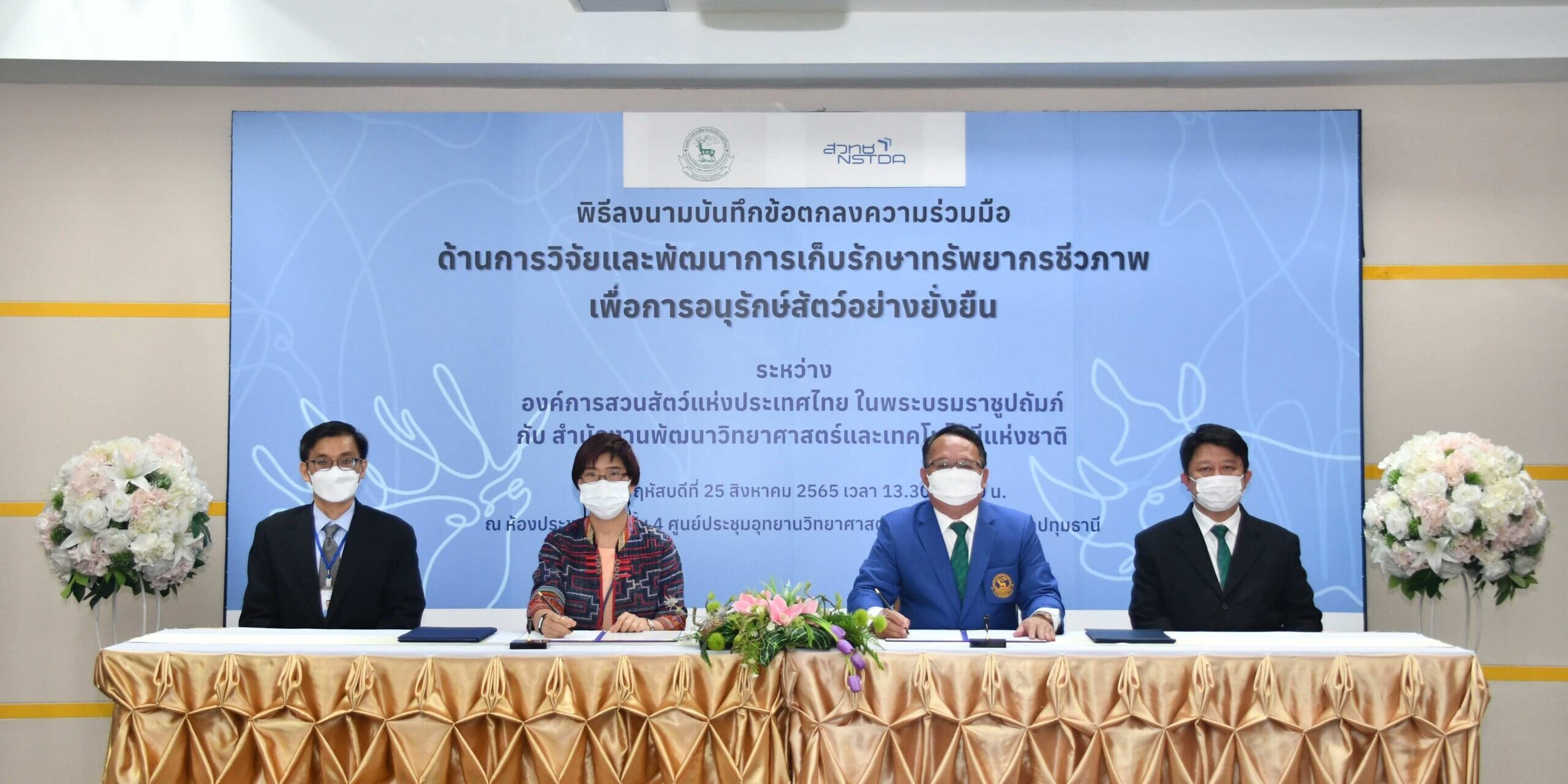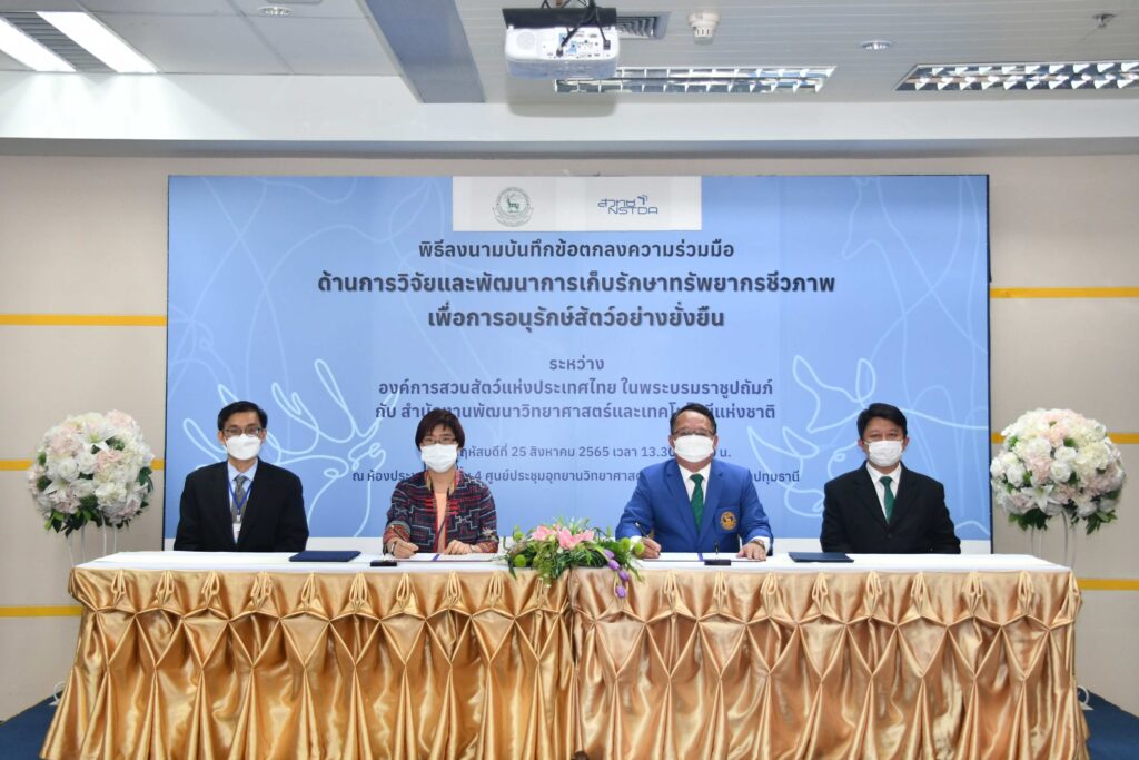 วันที่ 25 สิงหาคม 2565 ณ ห้อง 403 อาคารศูนย์ประชุม อุทยานวิทยาศาสตร์ประเทศไทย อ.คลองหลวง จ.ปทุมธานี : ดร.ลดาวัลย์ กระแสร์ชล รองผู้อำนวยการสำนักงานพัฒนาวิทยาศาสตร์และเทคโนโลยีแห่งชาติ (สวทช.) พร้อมด้วย นายอรรถพร ศรีเหรัญ ผู้อำนวยการองค์การสวนสัตว์แห่งประเทศไทย ร่วมลงนามในบันทึกข้อตกลงความร่วมมือด้านการวิจัย พัฒนา และ วิชาการ เกี่ยวกับทรัพยากรชีวภาพและฐานข้อมูลของประเทศไทย ระหว่าง องค์การสวนสัตว์แห่งประเทศไทย และ สำนักงานพัฒนาวิทยาศาสตร์และเทคโนโลยีแห่งชาติ โดยมี ดร.ศิษเฎศ ทองสิมา ผู้อำนวยการธนาคารทรัพยากรชีวภาพแห่งชาติ นักวิจัยและนักวิชาการทั้งสองหน่วยงานร่วมงาน
