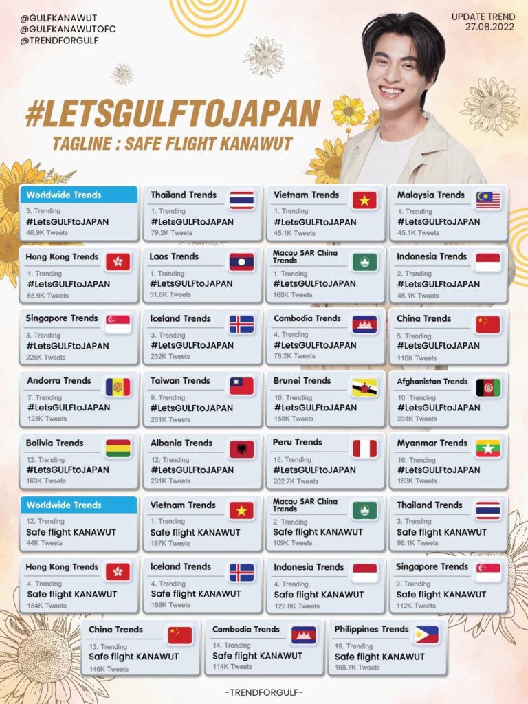 นอกจากกำลังใจที่ทั้งแฟนไทยและอินเตอร์แฟนร่วมส่งให้ทางหนุ่มกลัฟและทีมงานเดินทางไปจัดแฟนมีตติ้งแล้ว ยังส่งผลให้เทรนด์ #LetsGULFtoJAPAN พุ่งขึ้นอันดับที่ 3 ของ เทรนด์โลก และครองอันดับ 1 ร่วม 6 ประเทศ อาทิ ประเทศไทย เวียดนาม มาเลเซีย ฮ่องกง สปป.ลาว และเขตบริหารพิเศษมาเก๊าแห่งสาธารณรัฐประชาชนจีน เป็นต้น