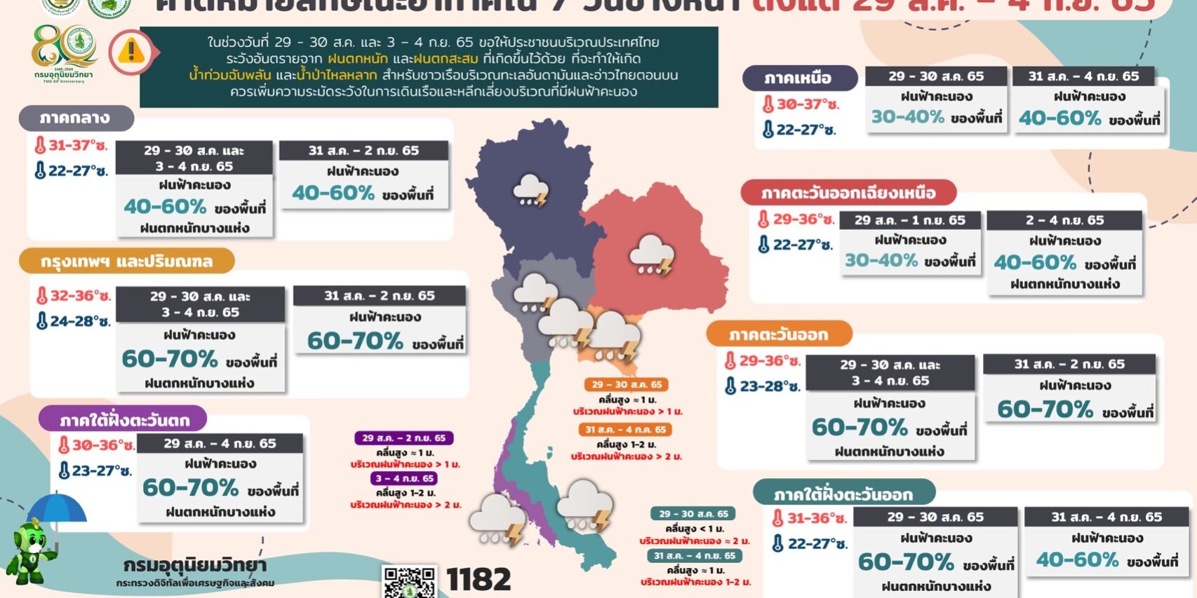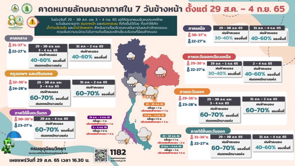 🎯🎯ข้อควรระวัง ในช่วงวันที่ 30 ส.ค. และ 3 – 4 ก.ย. 65 ขอให้ประชาชนบริเวณประเทศไทย ระวังอันตรายจากฝนตกหนักและฝนตกสะสมที่เกิดขึ้นไว้ด้วย ที่จะทำให้เกิดน้ำท่วมฉับพลันและน้ำป่าไหลหลาก สำหรับชาวเรือบริเวณทะเลอันดามันและอ่าวไทยตอนบนควรเพิ่มความระมัดระวังในการเดินเรือและหลีกเลี่ยงบริเวณที่มีฝนฟ้าคะนอง