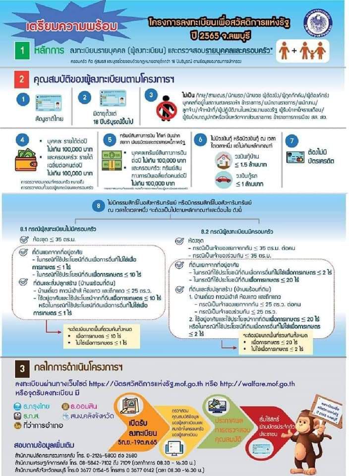 ร่วมกับคลังจังหวัดลพบุรี และธนาคารทุกแห่ง ซึ่งโครงการลงทะเบียนเพื่อสวัสดิการแห่งรัฐ ปี 2565 เปิดรับลงทะเบียน ตั้งแต่วันที่ 5 กันยายน – 19 ตุลาคม 2565 โดยลงทะเบียนผ่านเว็บไซต์ https://xn--12cm1ane3a8dcb9a6abq9eehm8a4u7e.mof.go.th/ หรือ https://walfare.mof.go.th หรือจุดรับลงทะเบียน ได้แก่ สนง.คลังจังหวัด ธ.กรุงไทย ธ.ก.ส. ธ.ออมสิน และที่ว่าการอำเภอทุกแห่ง