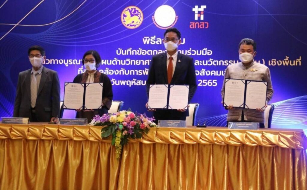 วันที่ 1 ก.ย.65 เวลา 10.00 น. ณ โรงแรมโรยัล ปริ้นเซส ถ.หลานหลวง กทม. : นายสุทธิพงษ์ จุลเจริญ ปลัดกระทรวงมหาดไทย เปิดเผยว่า กระทรวงมหาดไทย สภาพัฒนาการเศรษฐกิจและสังคมแห่งชาติ และสำนักงานคณะกรรมการส่งเสริม วิทยาศาสตร์ วิจัย และนวัตกรรม ได้ร่วมลงนามบันทึกข้อตกลงความร่วมมือแนวทางบูรณาการแผนด้านวิทยาศาสตร์ วิจัย และนวัตกรรม (ววน.) เชิงพื้นที่เพื่อให้สอดคล้องกับการพัฒนาเศรษฐกิจสังคมเชิงพื้นที่ โดยมุ่งเน้นนำองค์ความรู้จากวิทยาศาสตร์ ผลงานวิจัย และผลผลิตที่เป็นนวัตกรรมมาใช้ให้เกิดประโยชน์ในการพลิกโฉมประเทศ ในการพัฒนาพื้นที่ พัฒนาจังหวัด และกลุ่มจังหวัด อีกทั้งยกระดับคุณภาพชีวิตของประชาชนให้มีความสุขอย่างยั่งยืน อันจะเป็นทางเลือก และทางรอดสำหรับอนาคต