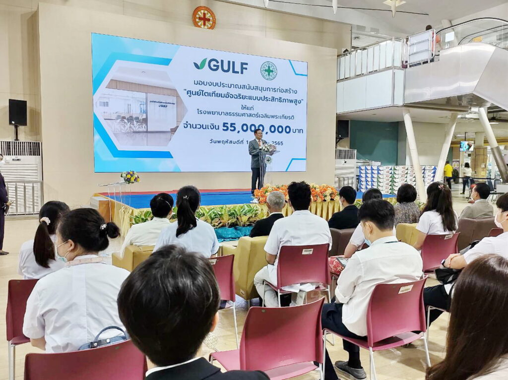 นายสารัชถ์ รัตนาวะดี ประธานเจ้าหน้าที่บริหาร บริษัท กัลฟ์ เอ็นเนอร์จี ดีเวลลอปเมนท์ จำกัด (มหาชน) กล่าวว่า ที่ผ่านมา GULF ได้มีการดำเนินโครงการด้านสาธารณสุขมาอย่างต่อเนื่อง โดยสถานการณ์การแพร่ระบาดของโควิด-19 ที่แพร่ระบาดมากว่า 2 ปี ส่งผลกระทบต่อเศรษฐกิจ และคุณภาพชีวิตของผู้คนเป็นวงกว้าง ซึ่งผู้ป่วยโรคไตนั้นถือเป็นอีกกลุ่มที่ต้องดูแลเป็นพิเศษ มีความเสี่ยงสูงต่อการติดเชื้อ เนื่องจากก่อนหน้านี้ หลายโรงพยาบาลจำเป็นต้องเลื่อนนัดผู้ป่วยออกไปเป็นจำนวนมาก จนส่งผลไปถึงผู้ป่วยที่จำเป็นต้องฟอกเลือดหรือปลูกถ่ายไต โดยทาง GULF ตระหนักว่าปัญหาของผู้ป่วยโรคไต และผู้ป่วยโรคเรื้อรังไม่ได้มีแค่เรื่องค่ารักษาพยาบาลเท่านั้น แต่ยังพบปัญหาค่าใช้จ่ายของผู้ป่วยที่ต้องเดินทางไปฟอกเลือด และค่าใช้จ่ายอื่น ๆ ทาง GULF จึงมุ่งหวังว่าการมอบเงินสนับสนุนการก่อสร้างศูนย์ไตเทียมนี้จะช่วยส่งเสริมคุณภาพชีวิตของผู้ป่วยโรคไต และเป็นศูนย์การแพทย์ที่เป็นประโยชน์ต่อทางโรงพยาบาลในระยะยาวต่อไป