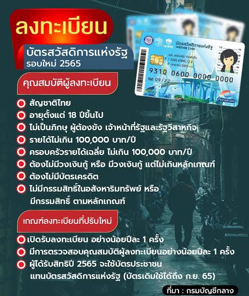 ตามที่รัฐบาล และกระทรวงการคลัง ได้มีมติเห็นชอบการกำหนดระยะเวลาในการดำเนินการโครงการลงทะเบียนเพื่อสวัสดิการแห่งรัฐปี 2565 หรือบัตรคนจน