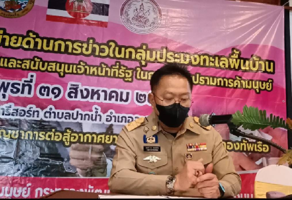 วันนี้ 2 กันยายน 2565 ทัพเรือภาคที่ 3 มอบหมายให้ น.ท.รัฐพล แก้วกระจาย ผู้บังคับหน่วยปฏิบัติการ หน่วยบัญชาการต่อสู้อากาศยานและรักษาฝั่งที่ 452 จัดอบรมจัดโครงการสร้างเครือข่ายด้านการข่าวในกลุ่มประมงทะเลพื้นบ้าน เพื่อการแก้ไขปัญหา ป้องกันและสนับสนุนเจ้าหน้าที่รัฐในการปราบปรามการค้ามนุษย์