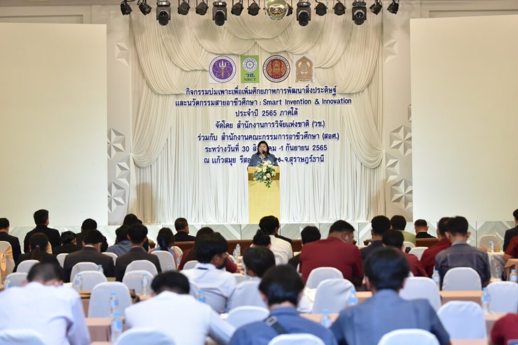 สำนักงานการวิจัยแห่งชาติ (วช.) กระทรวงการอุดมศึกษา วิทยาศาสตร์ วิจัยและนวัตกรรม (อว.) ร่วมกับ สำนักงานคณะกรรมการการอาชีวศึกษา (สอศ.) จัดกิจกรรม “การบ่มเพาะเพื่อเพิ่มศักยภาพการพัฒนาสิ่งประดิษฐ์และนวัตกรรมสายอาชีวศึกษา : Smart Invention & Innovation ประจำปี 2565 ภาคใต้” โดยมี ดร.วิภารัตน์ ดีอ่อง ผู้อำนวยการสำนักงานการวิจัยแห่งชาติ เป็นประธานเปิดงานพร้อมปาฐกถาพิเศษ เรื่อง “พัฒนาคน พัฒนาอาชีวะ : เพื่อการพัฒนาประเทศอย่างยั่งยืน” เมื่อวันที่ 30 สิงหาคม 2565 ที่ผ่านมา ณ แก้วสมุย