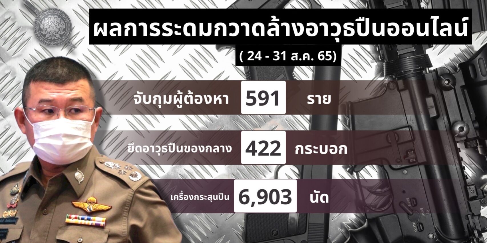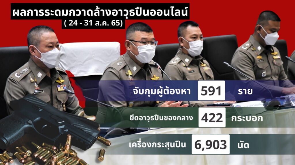 จึงได้สั่งการให้ ศปอส.ตร,บช.น.,บช.ภ.1-9 ระดมกวาดล้างอาชญากรรมทางออนไลน์ โดยเฉพาะการลักลอบขายอาวุธปืน ตั้งแต่วันที่ 24-31 ส.ค.65 โดยหน่วยงาน บช.ก.,บช.น.,สอท. และ บช.ภ.1-9 สามารถจับกุมผู้ต้องหาทั้งสิ้น 1,967 ราย แบ่งเป็นคดีอาวุธปืน 502 ราย พร้อมของกลางอาวุธปืน 422 กระบอก เครื่องกระสุน 6,903 นัด ยาบ้า 6,257 เม็ด และยาไอซ์ 400 กรัม ในส่วนของ ศปอส.ตร. จับกุมผู้ต้องหาทั้งสิ้น 183 ราย มูลค่าความเสียหาย 58 ล้านบาท จับบัญชีม้ากดเงิน จำนวน 350 หมาย ผู้ต้องหา 365 ราย