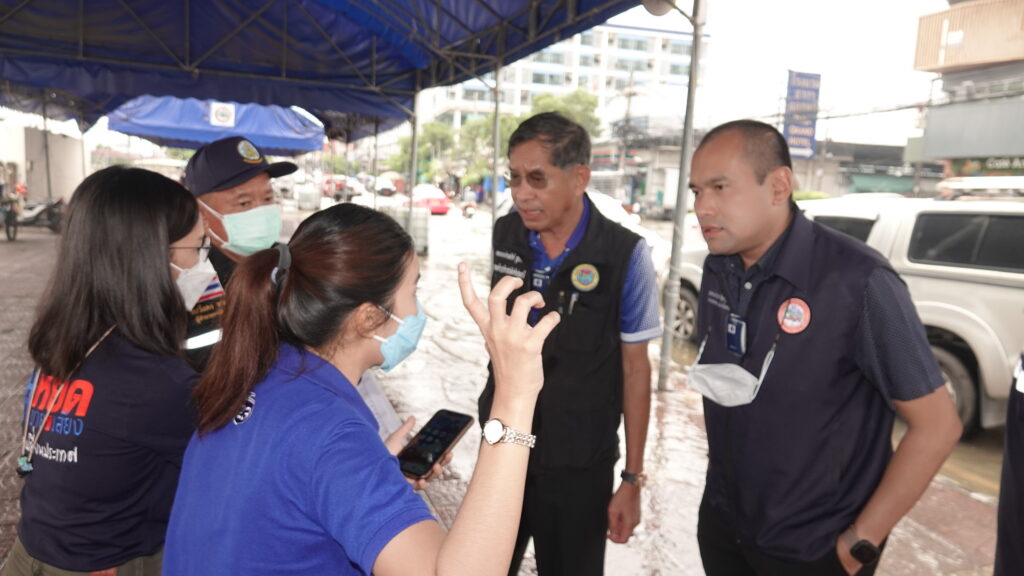 ร้อยตำรวจเอก ดร.ตรีลุพธ์ ธูปกระจ่าง นายกเทศมนตรีนครรังสิต กล่าวว่า เนื่องจากบริเวณชุมชนสะพานแดงเป็นจุดที่ตำที่สุด เราจึงจะทำตรงนี้เป็นศูนย์บัญชาการรับเรื่องราว หากตรงนี้ไม่ท่วมตรงอื่นก็ไม่ท่วมแล้ว จะมีการนำทรายมาลงเพื่อให้ประชาชนนำไปใช้กรอกกระสอบทราย โดยผมอยู่พื้นที่ตรงนี้ตั้งแต่เมื่อคืน ซึ่งน้ำมาจากกรุงเทพฯและจ.นครนายกมารวมที่รังสิต เมื่อฝนตกนำให้น้ำสูงขึ้นมาอีก ส่วนการบริหารการจัดการน้ำออกจากคลองรังสิตประยูรศักดิ์ลงสู่แม่น้ำเจ้าพระยาได้ดี น้ำจึงมาร่วมอยู่ที่นี่ เราจึงขอความร่วมมืออย่าพึ่งผันน้ำมาที่เรา หากวันนี้มีฝนตกมาอีก แล้วยังผลันน้ำออกไปไม่ได้ อย่างไรก็ท่วมอีก ซึ่งกรมชลประทานและแขวงทางหลวง ซึ่งทางเทศบาลเรายินดีที่จะช่วยกันอยู่แล้ว วันนี้เราได้รับความร่วมมือกับกรมชลประทาน ที่มาร่วมมหารือกับ ท่านนายก อบจ.ปทุมธานี แต่ทางแขวงทางหลวงไม่ได้มา ผมขอความกรุณาช่วยเหลือกัน มาบูรณาการร่วมกัน โดยที่ถนนยังไม่มีท่อที่จะระบายน้ำได้ บริเวณทางกลับรถใต้สะพานต่ำกว่าน้ำทำให้ประชาชนไม่สามารถใช้เส้นทางได้ ทางแขวงทางหลวงยังไม่มีเครื่องจักรมาช่วยสูบน้ำเลย จึงอยากให้มาช่วยกัน เมื่อประชาชนเดือดร้อนจึงเกิดปัญหามาก.