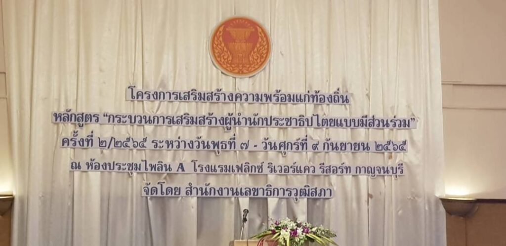 วันที่ ๗-๙ กันยายน ๒๕๖๕ เวลา ๑๐.๐๐ น.ณ ห้องประชุมไพลิน A โรงแรมเฟลิกซ์ ริเวอร์ แคว รีสอร์ท จังหวัดกาญจนบุรี พลเอก พิศณุ พุทธวงศ์ สมาชิกวุฒิสภา ประธานเปิด และปาฐกถาพิเศษเรื่อง “บทบาทหน้าที่และอำนาจของวุฒิสภา นายกองเอก พงศธร ศิริสาคร รองผู้ว่าราชการจังหวัดกาญจนบุรี กล่าวต้อนรับ นายสาธิต วงศอนันต์นนท์ ผู้อำนวยการสำนักประชาสัมพันธ์ กล่าวรายงาน ของการจัดอบรม ฯ นายพลเดช ปิ่นประทีป สมาชิกวุฒิสภา บรรยายให้ความรู้ ด้านยุทธศาสตร์ชาติและการปฏิรูปประเทศ ต่อด้วย