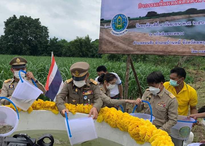 วันพฤหัสบดีที่ 8 กันยายน 2565 เวลา 09.30 น. นายนิวัฒน์ รุ่งสาคร ผู้ว่าราชการจังหวัดลพบุรี ให้การต้อนรับ พลอากาศเอก ชลิต พุกผาสุข องคมนตรี ประธานอนุกรรมการติดตามและขับเคลื่อนโครงการอันเนื่องมาจากพระราชดำริในพื้นที่ภาคกลาง พร้อมด้วย พลอากาศเอก จอม รุ่งสว่าง องคมนตรี รองประธานอนุกรรมการฯ นายสมศักดิ์ เพิ่มเกษร รองเลขาธิการ กปร. และคณะอนุกรรมการฯ เดินทางไปติดตาม ตรวจเยี่ยมโครงการจัดหาแหล่งน้ำสนับสนุนพื้นที่ตำบลดอนดึงอันเนื่องมาจากพระราชดำริ อำเภอบ้านหมี่ จังหวัดลพบุรี ซึ่งพระบาทสมเด็จพระบรมชนกาธิเบศร มหาภูมิพลอดุลยเดชมหาราช บรมนาถบพิตร ทรงพระกรุณาโปรดเกล้าฯ รับโครงการพัฒนาแหล่งน้ำคลองห้วยตาเหลือง คลองหนองกระสังข์ และแก้มลิงสระหลวง ไว้เป็นโครงการอันเนื่องมาจากพระราชดำริ เพื่อช่วยเหลือราษฎรซึ่งประสบความเดือดร้อนจากการขาดแคลนน้ำ ในการอุปโภค บริโภคและทำการเกษตร นอกจากนี้ ได้ร่วมกันปล่อยพันธุ์ปลา ตะเพียนขาว ตะเพียนทอง สร้อยขาว รวมจำนวน 20,000 ตัว