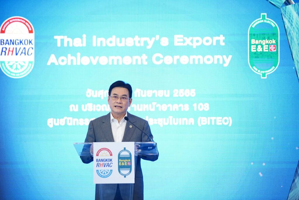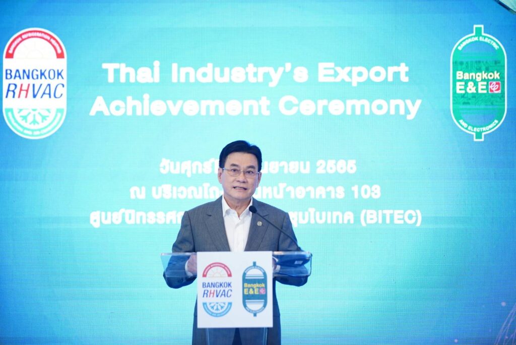 นายจุรินทร์ฯ กล่าวว่า อุตสาหกรรมเครื่องใช้ไฟฟ้าและอิเล็กทรอนิกส์มีความสำคัญอย่างมากต่อเศรษฐกิจไทยเพราะก่อให้เกิดความสร้างงานในประเทศมากกว่า 640,000 คนสร้างรายได้จากการส่งออกมากกว่า 2 ล้านล้านบาท 7 เดือนแรกของปีนี้ สามารถส่งออกได้แล้วถึง 1.4 ล้านล้านบาท ปัจจุบันประเทศไทยถือว่าเป็นฐานการผลิตเครื่องใช้ไฟฟ้าและอิเล็กทรอนิกส์ที่สำคัญแห่งหนึ่งของโลก การส่งออกเฉพาะเครื่องปรับอากาศเป็นอันดับ 2 ของโลก และส่งออกเครื่องทำความเย็น ทั้งตู้เย็น ห้องแช่ ห้องเย็น เป็นอันดับ 6 ของโลก เพราะเราสามารถได้ผลิตครบวงจร ทางต้นน้ำและปลายน้ำ รวมถึงการคิดค้นนวัตกรรม สำหรับปีนี้งานแสดงสินค้าเครื่องปรับอากาศและเครื่องทำความเย็น (Bangkok RHVAC 2022) และงานแสดงสินค้าเครื่องใช้ไฟฟ้าและอิเล็กทรอนิกส์ (Bangkok E&E 2022) ถือว่ากลับมาจัดในรูปแบบปกติในรอบ 3 ปี ภายใต้แนวคิด “ONE STOP SOLUTIONS – New Innovations for New Global Challenges”