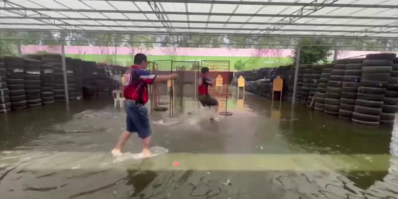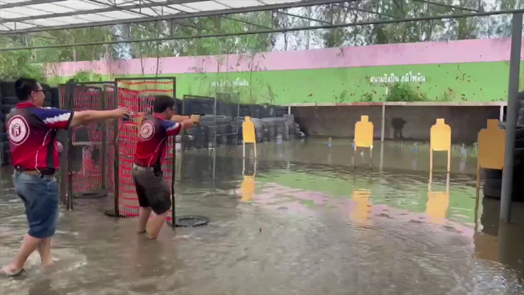 วันที่ 11 กันยายน 2565 ที่สนามยิงปืนภูมิไพลิน ตำบลคลองสี่ อำเภอคลองหลวง จังหวัดปทุมธานี สีสันสนามยิงปืน แม้น้ำจะท่วมแต่สมาชิกนักกีฬายิงปืนยังลุยน้ำมาฝึกซ้อมยิงปืนกันในน้ำ แม้มีอุปสรรค