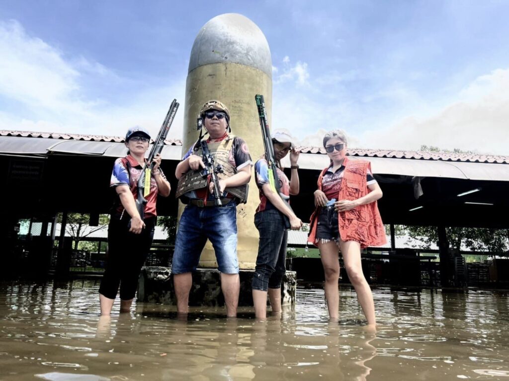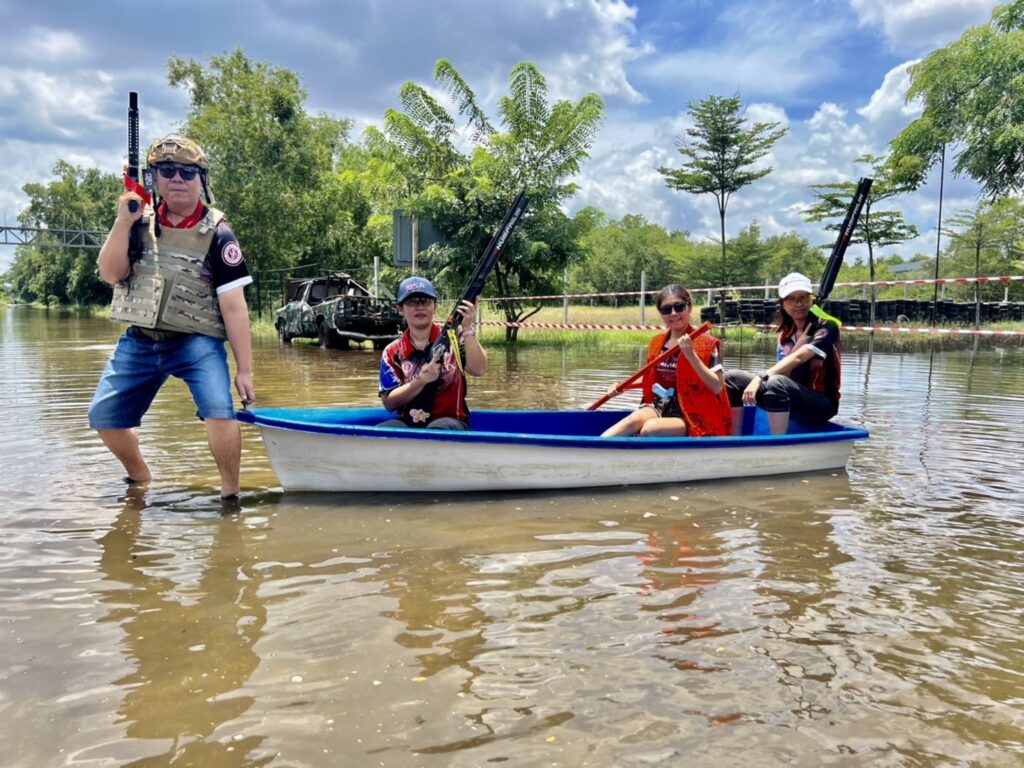 เอารถยกสูงเข้ามาใช้ที่สนาม ซึ่งรถเก๋งไม่สามารถขับเข้ามาได้ เนื่องจากระดับน้ำท่วมสูงระดับหัวเข่า ส่วนบางคนก็ต้องให้เรือออกไปรับมาซ้อมยิงปืนกันในน้ำ ถือว่าเป็นการเผชิญอุปสรรคยุทธวิธีต่าง ๆ ซึ่งทางสนามจะมีบริการอาวุธปืนให้เช่า และจัดส่งกระสุนให้ มีช่องยิงแม่นยำ สนามรณยุทธ และสนามสำหรับยิงเป้าบินที่มีความมาตรฐาน และมีระบบปลอดกันความปลอดภัยตามมาตรฐานสนามยิงปืน.