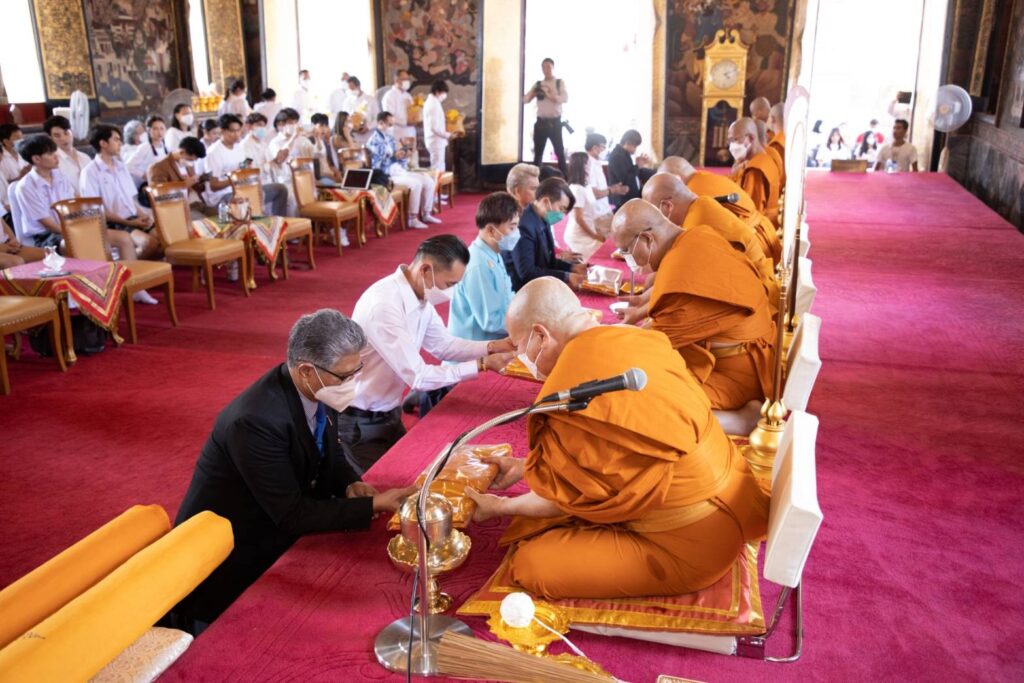 จากนั้นนำกล่าวคำถวายมหาสังฆทาน และเชิญแขกผู้มีเกียรติร่วมถวายผ้าไตร จำนวน ๙ ผืน เจ้าภาพโดย คุณฮันนี่ ณภัค มุทธาเสถียร นักแสดงจากซีรี่ส์ธรรมะ “นางวิสาขา” ททบ.5, ชุดสังฆทาน เจ้าภาพโดย คุณสุพิชญา ไพฑูลย์ กรรมการผู้จัดการ บริษัท เพชรวดีก่อสร้าง จำกัด, ชุดไทยธรรม และสังฆทานจากตัวแทน กลุ่มนักเรียนดี