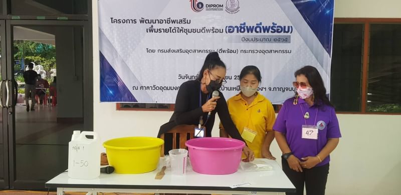 วันที่ 12 ก.ย.65 เวลา 09.30 น. ณ.ที่ศาลาวัดอุดมมงคล (วัดเขาน้อย) ต.ปากแพรก อ.เมือง จ.กาญจนบุรี พลเอก สมชาย วิษณุวงศ์ ส.ส.เขต 1 กาญจนบุรี และกรรมาธิการทหาร มอบหมายให้ ดร.อำนาจ สุนทรธรรม เลขา ฯ เป็นประธานเปิด การอบรม ฝึกอาชีพเสริมเพิ่มรายได้ ให้กับชุมชนคนเขตเทศบาลเมืองกาญจนบุรี โดยมีนายชูศักดิ์ สุนทรธรรม อดีตกำนันตำบลปากแพรก ผู้ประสานงาน นายชาติชาติ ตั้งต้นตระกูล ผู้แทนศูนย์ส่งเสริมอุตสาหกรรมภาค 8 ลพบุรีนำวิทยากรผู้มากด้วยประสบการณ์ และความสามารถ มาเป็นวิทยากรบรรยาย ทั้งทฤษฎี และภาคปฏิบัติ นำโดย ดร.ตรีรัตน์ ชูชม นวลฉวี ดีเปี่ยม ทศา แสนล้อม และนายประเสริฐ แสนล้อม มาสร้างความรู้ ของการทำสบู่เหลว การทำน้ำยาล้างจาน การทำเหรียญโปรยทาน และการสกรีนกระเป๋าผ้า จากศูนย์กรมส่งเสริมอุตสาหกรรมภาค 8 ลพบุรีที่สามารถนำไปประกอบเป็นอาชีพเสริม หรือไว้ใช้เองก็ได้ โดยมีผู้สนใจเข้าร่วมฝึกอบรม จำนวน 200 คน