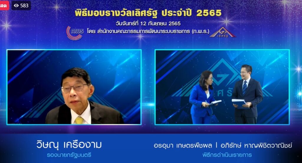 ศาสตราจารย์กิตติคุณ วิษณุ เครืองาม รองนายกรัฐมนตรี ได้มอบ รางวัลเลิศรัฐ ให้แก่สำนักงานการวิจัยแห่งชาติ (วช.) โดยมี ดร.วิภารัตน์ ดีอ่อง ผู้อำนวยการสำนักงานการวิจัยแห่งชาติ (วช.) เข้ารับรางวัลเลิศรัฐ ประจำปี 2565 “สาขาบริการภาครัฐ ประเภทพัฒนาการบริการ กองระบบและบริหารข้อมูลเชิงยุทธศาสตร์ ด้านวิทยาศาสตร์ วิจัยและนวัตกรรม ผลงานระบบข้อมูลสารสนเทศวิจัยและนวัตกรรม (NRIIS) รางวัล ระดับ “ดี”” โดยการมอบรางวัลผ่านสื่ออิเล็กทรอนิกส์ เป็นการมอบรางวัลให้แก่หน่วยงานภาครัฐที่มีผลงานดีเด่นด้านการให้บริการประชาชน
