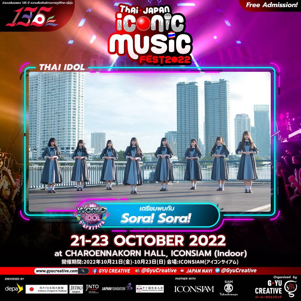 ไม่เพียงแค่นั้น บนเวที Thai-Japan Iconic Music Fest 2022 ยังขนเหล่าไอดอลมาอีกเพียบ ทั้ง Sora! Sora! วงไอดอลไทยที่มีกลิ่นอายความเป็นญี่ปุ่น จากค่าย Catsolute ภายใต้คอนเซ็ปต์ “ตัวแทนของท้องฟ้าในทุกฤดูกาล” ไม่ว่าจะเป็น ฤดูใบไม้ผลิที่เป็นเหมือนฤดูแห่งการเริ่มต้นใหม่ ฤดูร้อนที่เต็มไปด้วยพลังและความสดใส ฤดูใบไม้ร่วงที่สื่อถึงการเปลี่ยนแปลง ฤดูหนาวที่แสนเหงาและโดดเดี่ยว และฤดูฝนที่นำพาความเศร้าทำให้ใจเราเปียกปอน โดยไม่ว่าจะเป็นฤดูไหนของชีวิต ทุกอย่างก็จะต้องดำเนินต่อไปภายใต้ท้องฟ้าอันกว้างใหญ่เดียวกัน