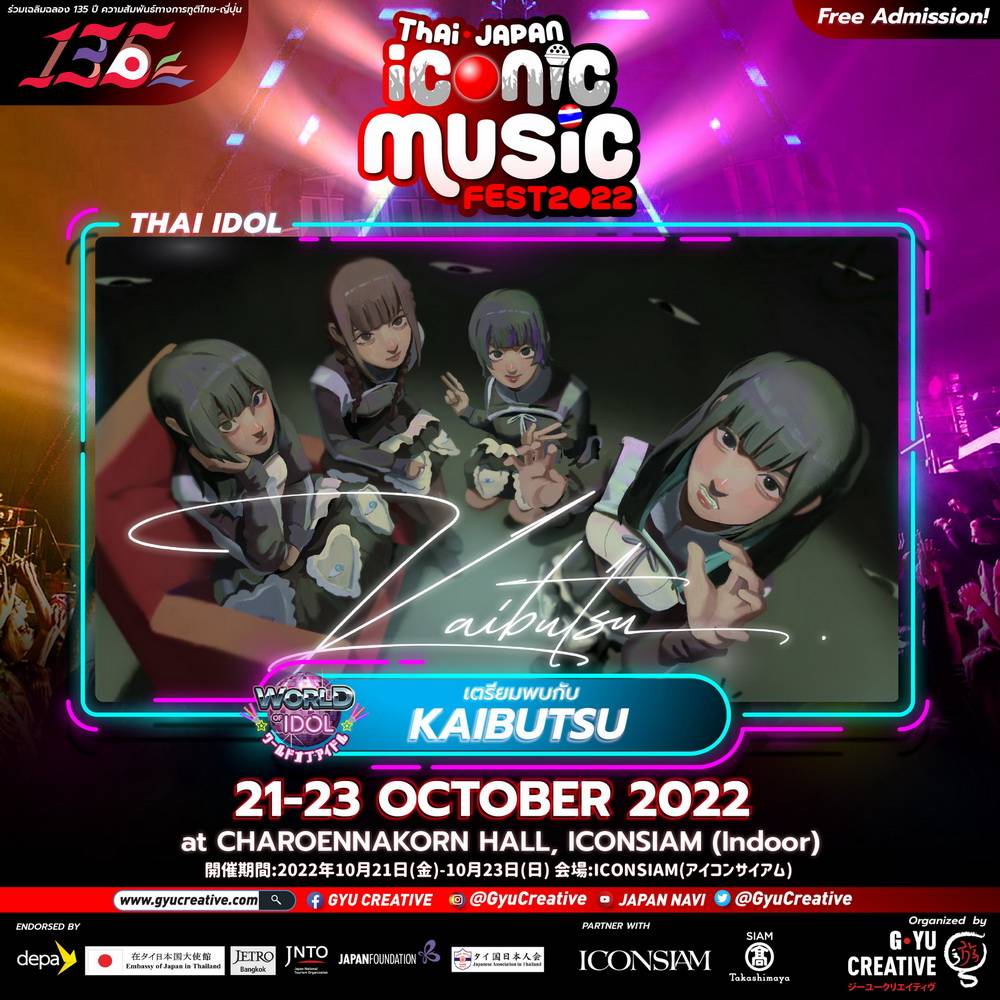 KAIBUTSU วงไอดอลคอนเซ็ปต์ Super Cheerful and Crazyเปรียบดั่งเชื้อเพลิงแผดเผา นามว่า KAIBUTSU มาพร้อมกับ Performance ที่จะสะกดผู้ชมจนไม่อาจละสายตาได้และ แผดเผาทุกสิ่งรอบตัวตราบใดที่ยังมีความมืดมิดและเสียงเพลงอยู่