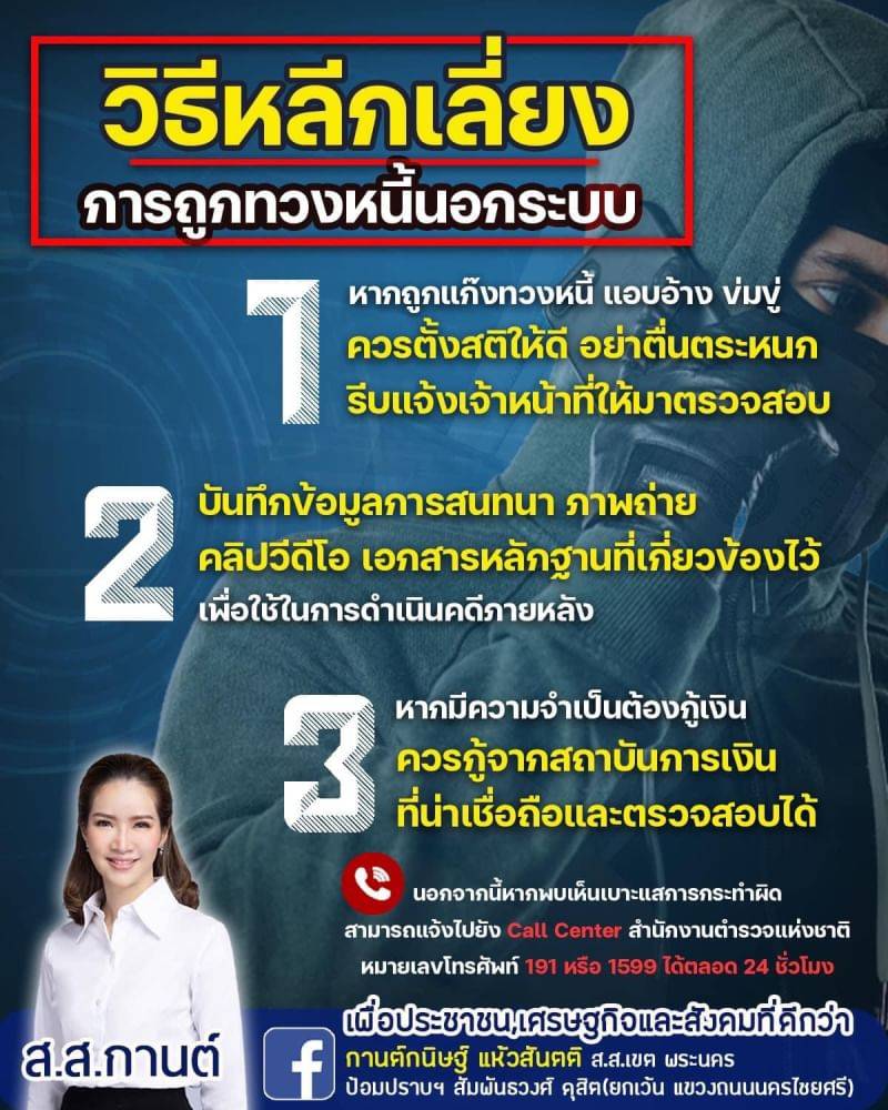 - หากถูกแก๊งทวงหนี้ แอบอ้าง ข่มขู่ ควรตั้งสติให้ดี อย่าตื่นตระหนก