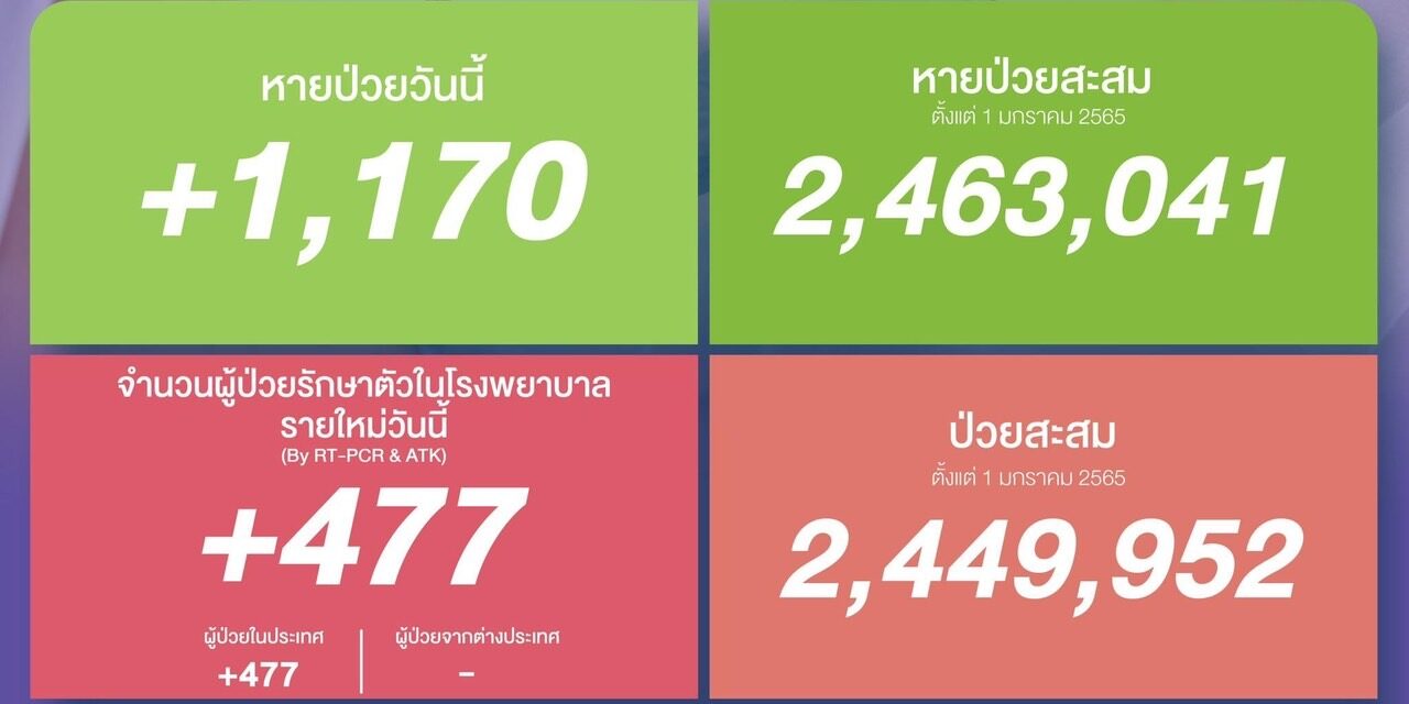หายป่วยสะสม 2,463,041 ราย (ตั้งแต่ 1 มกราคม 2565)