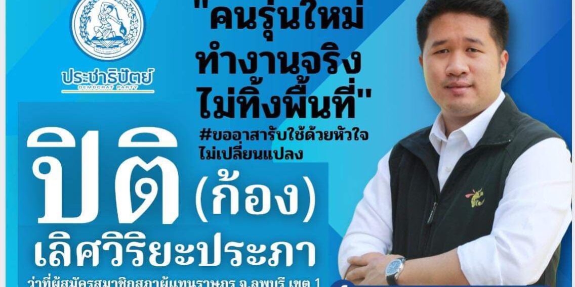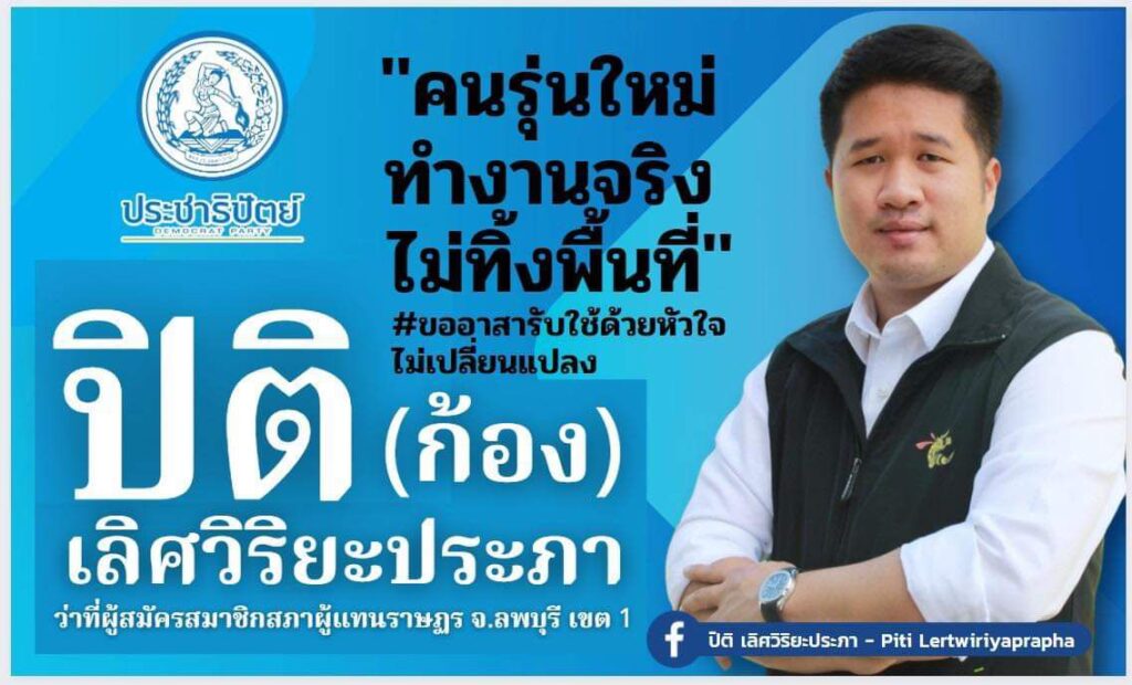 พรรคการเมืองเก่าแก่ หรือพรรคประชาธิปัตย์ ได้ส่งเด็กหนุ่มไฟแรง ดีกรีไม่ธรรมดา เป็นลูกชายหัวแก้วหูแหวน ของนักการเมืองท้องถิ่นชื่อดัง ก็คือนางสายใจ เลิศ วิริยะประภา นายกเทศมนตรีเมืองเขาสามยอด ลพบุรี ได้ส่งผู้ชายลงนายปิติ(ก้อง) เลิศวิริยะประภา สมัครรับเลือกตั้ง ว่าที่ผู้สมัครสมาชิกสภาผู้แทนราษฎร เขต 1 ลพบุรี สวมเสื้อพรรคประชาธิปัตย์ มีสโลแกนว่า