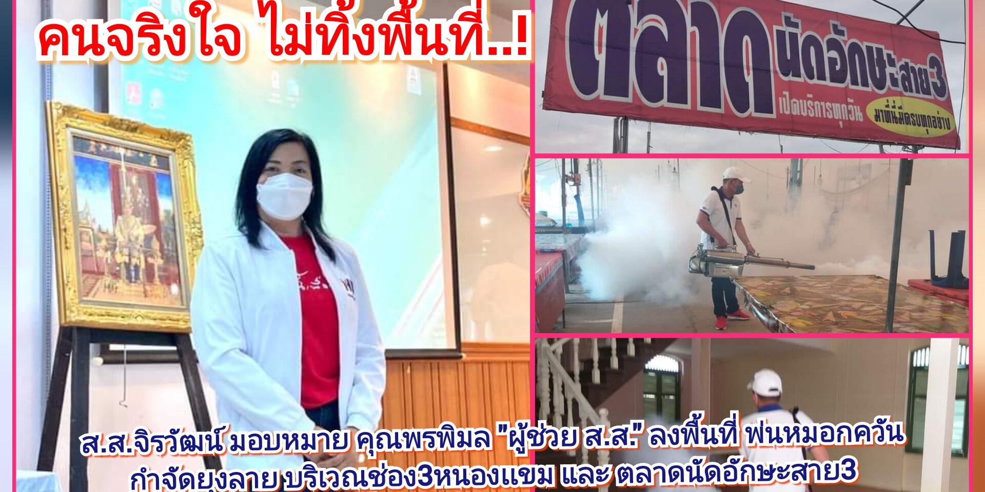 ทั้งนี้ในการลงพื้นที่วันนี้หลังจากรับเรื่องร้องขอจากพี่น้องประชาชน ในชุมชนต่างๆ กรณีปัญาหาการแพร่ระบาดของไข้เลือดออก อันเนื่องมาจากยุงลาย โดย ส.ส.จิรวัฒน์ อรัณยกานนท์ (ทนายบิลลี่) ส.ส.กทม. เขต27 เรงเห็นถึงความปลอดภัยและห่วงใยพี่น้องประชาชนจึง มอบหมายให้ คุณพรพิมล สูญญาจารย์ (เพ็ญ) ลงพื้นที่พ่นฉีดหมอกควันกำจัดยุงลาย ที่สถานีโทรทัศน์ช่อง3หนองเเขม และ ตลาดนัดอักษะพุทธมณฑลสาย3 เบื้องต้นผลการดำเนินการเป็นไปด้วยความเรียบร้อย