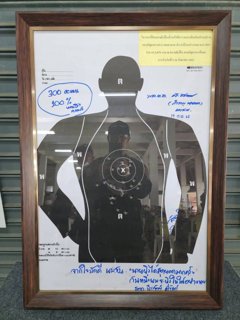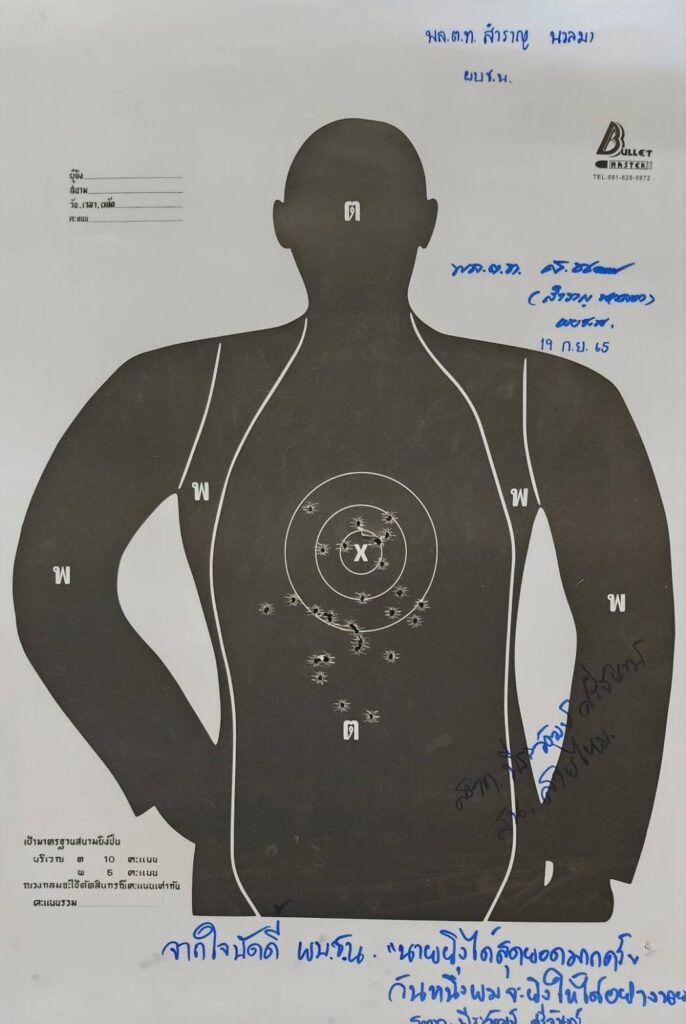 จากนั้นได้ทำการทดสอบยิงปืน ด้วยกระสุนจริง ในระบบเดียวกับที่ผู้รับการฝึกต้องทำการทดสอบ ผลการปฏิบัติ พล.ต.ท.สำราญฯ ผบช.น. ยิงได้คะแนน 300 คะแนนเต็ม 100%