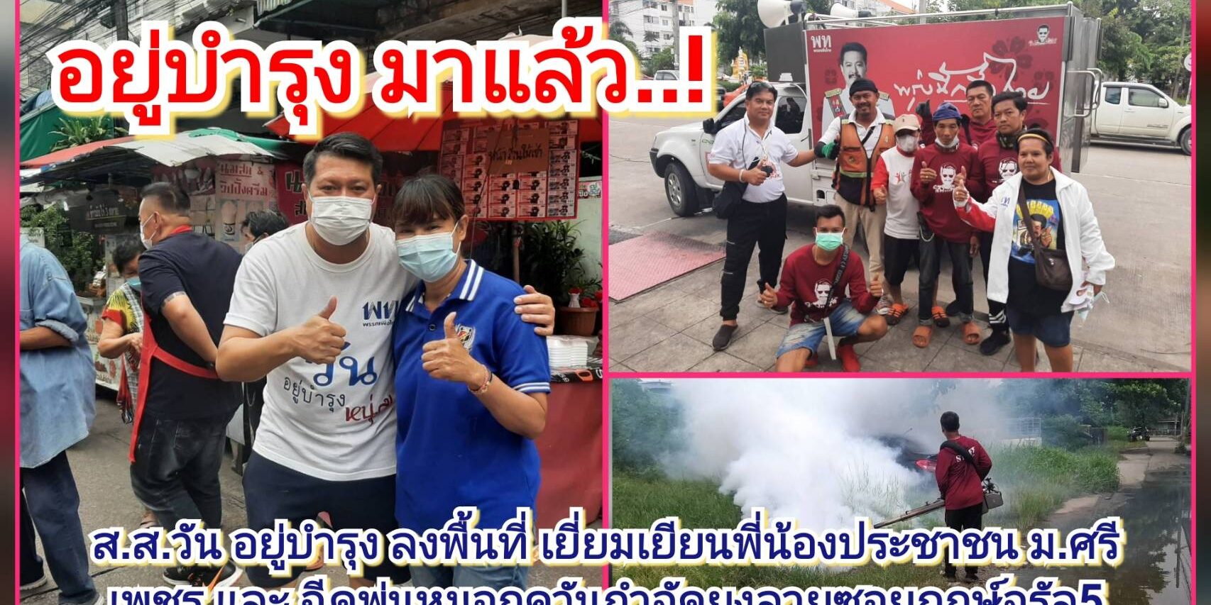 วันนี้ (20ก.ย.65) ส.ส.วัน อยู่บำรุง (พี่หนุ่ม) พรรคเพื่อไทย เขตบางบอน-หนองเเขม พร้อมด้วย นายต่อศักดิ์ ชุ่มทรวง (พี่ต่อปิ่น4) “ผู้ช่วย ส.ส.” และ ทีมงานอาสาสมัคร “ใจถึง พึ่งได้” ลงพื้นที่ เยี่ยมเยืยนพี่น้องประชาชนชุมชน ม.ศรีเพชร เพชรเกษม106 และ ฉีดพ่นหมอกควันกำจัดยุงลาย ซอยฤกษ์จรัล 5