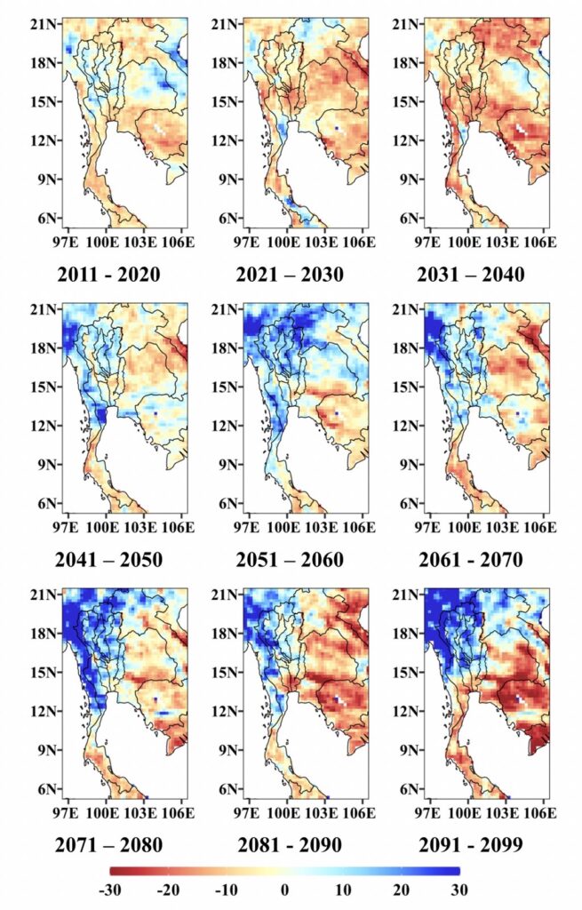 ผศ.ดร.จิรสรณ์ สันติสิริสมบูรณ์ หัวหน้าโครงการวิจัยศึกษาเปรียบเทียบการเปลี่ยนแปลงกระบวนการทางอุทกวิทยาและฟลักซ์ ของลุ่มน้ำจิวหลงและลุ่มน้ำเจ้าพระยา ศูนย์วิจัยการเปลี่ยนแปลงภูมิอากาศระดับภูมิภาคและพลังงานทดแทน มหาวิทยาลัยรามคำแหง เปิดเผยว่า การศึกษาวิจัยดังกล่าวเป็นความร่วมมือระหว่างนักวิจัยไทย และ จีน โดยใช้ลุ่มน้ำเจ้าพระยาเป็นโมเดลในการศึกษาเปรียบเทียบกับลุ่มน้ำจิวหลง ของจีน เนื่องจากมีลักษณะภูมิประเทศและภูมิอากาศใกล้เคียงกับประเทศไทย ทั้งนี้การศึกษาได้ขยายไปถึงลุ่มน้ำซึ่งเป็นต้นน้ำของลุ่มน้ำเจ้าพระยา ได้แก่ ลุ่มน้ำปิง วัง ยม น่าน และลุ่มน้ำอื่นที่เกี่ยวข้อง ข้อมูลจากแบบจำลองการคาดประมาณการเปลี่ยนแปลงภูมิอากาศในอนาคตที่ใช้ในการศึกษานี้ เป็นผลจากโครงการวิจัย SEACLID/CORDEX Southeast Asia ซึ่งเป็นความร่วมมือระหว่าง RU-CORE และนักวิจัยในภูมิภาคเอเชียตะวันออกเฉียงใต้ ได้แก่ ประเทศมาเลเซีย ฟิลิปปินส์ เวียดนาม และอินโดนีเซีย โดยได้มีการทดสอบการจำลองภูมิอากาศวิทยา (climatology) ในอดีตของประเทศไทยของแบบจำลองดังกล่าว เปรียบเทียบกับค่าจากการตรวจวัดเพื่อสร้างความเชื่อมั่น ในข้อมูลคาดประมาณการเปลี่ยนแปลงสภาพภูมิอากาศในอนาคต แบบจำลองทางอุทกวิทยาที่พัฒนาขึ้นมานี้ ได้จำลองเหตุการณ์ในอดีตโดยใช้ข้อมูลภูมิอากาศในช่วงปี ค.ศ.1970-ค.ศ.2005 และการคาดประมาณอนาคตในช่วงปี ค.ศ.2006-ค.ศ.2060 ผลการคาดประมาณการเปลี่ยนแปลงภูมิอากาศในอนาคต พบว่าประเทศไทยมีแนวโน้มที่ปริมาณฝนจะลดลง ซึ่งเป็นสัญญาณความถี่ของปีที่จะประสบปัญหาภัยแล้ง มากกว่าปีที่จะประสบปัญหาอุทกภัย แต่จะมีแนวโน้มของฝนที่ตกหนักมากขึ้น ซึ่งเป็นสัญญาณของการเกิดน้ำท่วมฉับพลัน แนวโน้มการเปลี่ยนแปลงภูมิอากาศดังกล่าว จะส่งผลกระทบโดยตรงต่อการผลิตในภาคการเกษตรและความมั่นคงทางอาหาร
