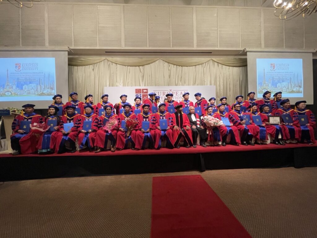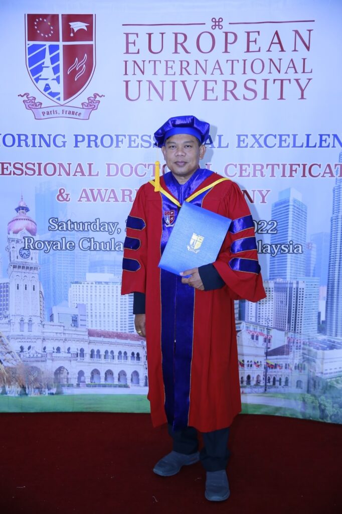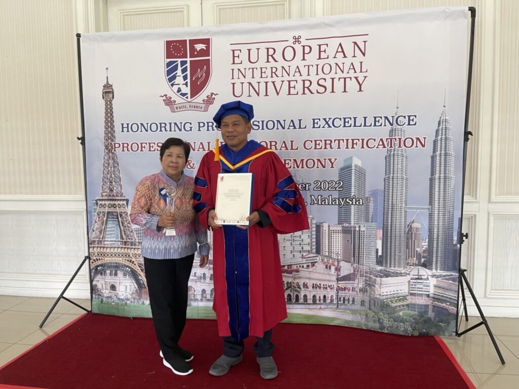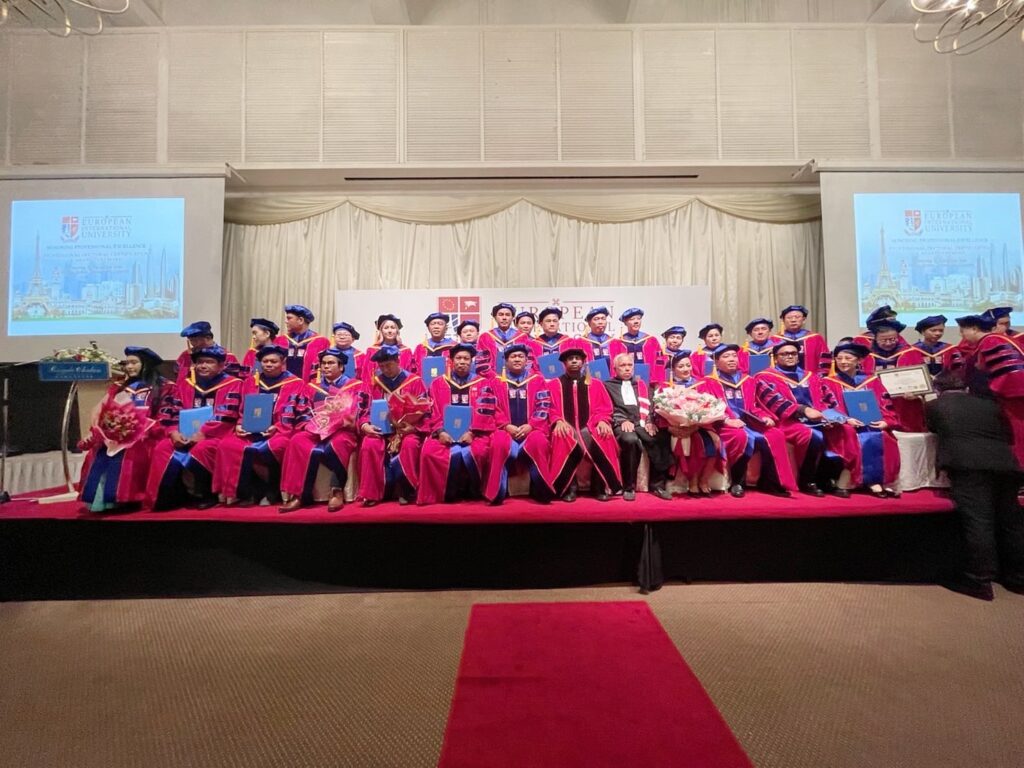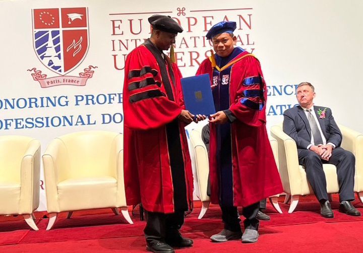 European International University (E.I.U) มหาวิทยาลัย อันดับที่ 65 ของโลก ตั้งอยู่ที่กรุงปารีส ประเทศฝรั่งเศส จัดมอบปริญญาดุษฎีบัณฑิตกิตติมศักดิ์ รุ่น 4 ขึ้น เมื่อวันเสาร์ที่ 24 กันยายน 2565 ณ โรงแรมโรยัล ชูรัน ดามันซารา กรุงกัวลาลัมเปอร์ ประเทศมาเลเซีย