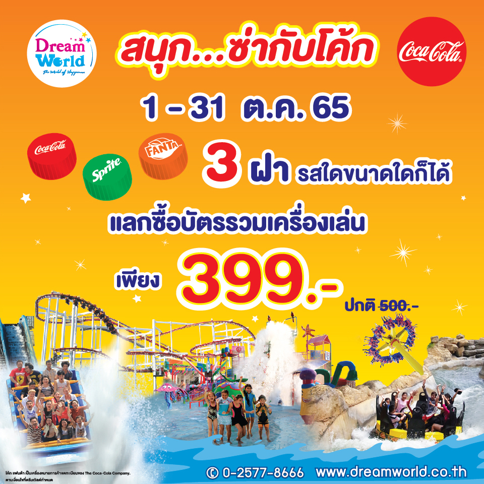 วันที่ 29 กันยายน 2565 ที่สวนสนุกดรีมเวิลด์ ตำบลบึงยี่โถ อำเภอธัญบุรี จังหวัดปทุมธานี นางสาวรัสรินทร์ มิลินวรพัฒน์ ผู้จัดการฝ่ายการตลาด ได้เปิดเผยว่า ช่วงเวลาแห่งความสุขของเด็ก ๆ มาถึงแล้ว ตุลาคมนี้ยกครอบครัวมาเที่ยวดรีมเวิลด์ กับโปรโมชั่นพิเศษ “ สนุกซ่า..กับโค้ก ” เริ่ม 1 – 31 ต.ค.65 ให้ลูกค้าทุกเพศทุกวัยได้สนุกกันแบบคุ้มสุด ๆ เพียงนำฝา โค้ก สไปร์ท แฟนต้า รสใด หรือขนาดใดก็ได้ 3 ฝา รับส่วนลดได้ทันที เมื่อซื้อบัตรรวมเครื่องเล่น จากราคาปกติ 500 บาท เหลือเพียง 399 บาท เท่านั้น