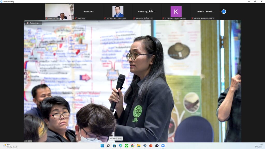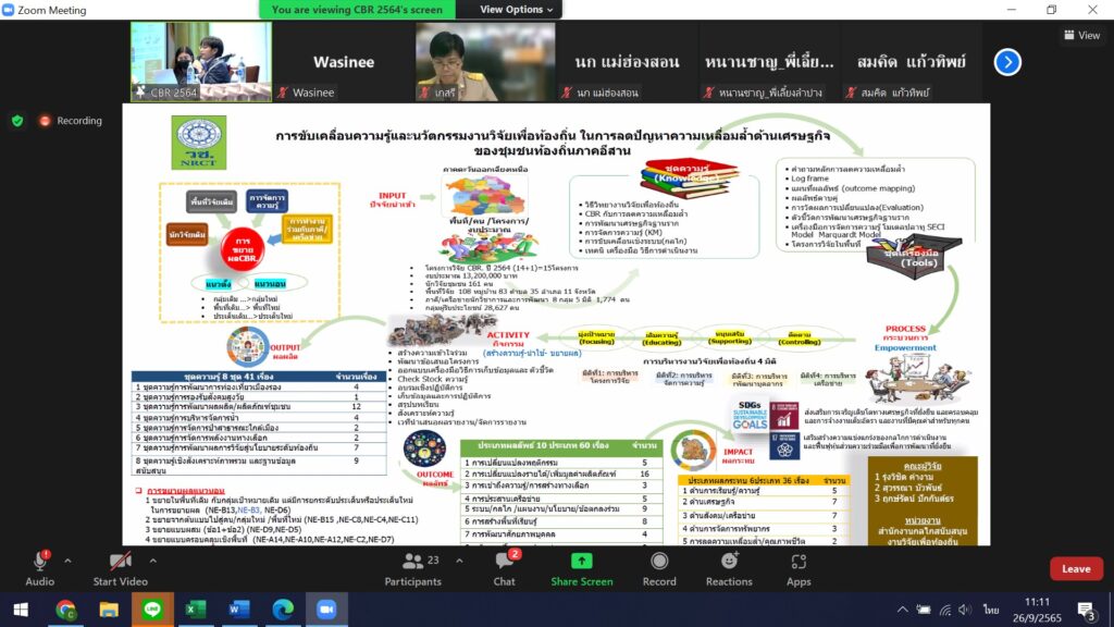 หลังจากนั้นคุณชีวัน ขันธรรม ทีม ODU (สถาบันคลังสมองของชาติ) ได้นำเสนอข้อมูลทบทวนการบริหารโครงการ CBR จากปี 63 สู่ 65 และผู้ประสานงานกลไกทั้ง 4 ภาค ได้ให้ข้อมูลภาพรวมของทั้ง 4 ภูมิภาค ประกอบด้วยภาคเหนือ โดย รศ.ดร.อาวรณ์ โอภาสพัฒนากิจ ภาคตะวันออกเฉียงเหนือ โดย คุณรุ่งวิชิต คำงาม ภาคกลาง โดย รศ.ดร.สุชาดา พงศ์กิตติวิบูลย์ และภาคใต้ โดย ดร.มายือนิง อิสอ และในช่วงท้ายมีกิจกรรมให้ผู้เข้าร่วมประชุมซึ่งเป็นนักวิจัยทุกโครงการได้แบ่งกลุ่มแลกเปลี่ยนข้อมูล และสรุปความรู้การพัฒนาเศรษฐกิจฐานรากโดยใช้งาน CBR และนำเสนอผลการสรุปความรู้การพัฒนาเศรษฐกิจฐานรากโดยใช้งาน CBR ด้วย