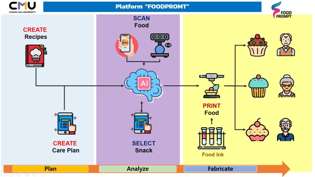 รองศาสตราจารย์ ดร.วัสสนัย วรรธนัจฉริยา หัวหน้าโครงการฯ กล่าวว่า ฟู้ดพร้อม เทคโนโลยีชาญฉลาดสำหรับการให้โภชนบำบัดและการผลิตอาหารแบบเฉพาะเจาะจง เป็นแพลตฟอร์มที่คณะผู้ประดิษฐ์มีที่มาจากสหสาขาวิชา ร่วมกันพัฒนาขึ้นโดยเชื่อมโยงการประยุกต์ใช้เทคโนโลยีชาญฉลาดในแต่ละสาขาเข้ามาตอบโจทย์การให้โภชนบำบัดและการผลิตอาหารแบบเฉพาะเจาะจง โดยจุดเริ่มต้นได้มุ่งเน้นกลุ่มเปราะบาง คือ ผู้ป่วยสูงอายุในโรงพยาบาล ซึ่งแพลตฟอร์มดังกล่าวมีความแปลกใหม่เพราะยังไม่พบผลงานที่มีการพัฒนาระบบที่เชื่อมโยงฐานข้อมูลผู้ใช้ กับข้อมูลอาหารที่ได้รับ เพื่อส่งต่อไปสู่การผลิตอาหารที่เหมาะสม โดยนำเอาแนวคิดปัญญาประดิษฐ์มาพัฒนาระบบสแกนอาหารแบบชาญฉลาดทั้งในรูปแบบแอพพลิเคชัน “ฟู้ดสแกนเนอร์” และเครื่องสแกนอาหารแบบชาญฉลาด “ปิ่นโต” ในการประเมินสารอาหารและพลังงานที่ผู้รับประทานได้รับในแต่ละมื้อ ซึ่งข้อมูลปริมาณอาหารที่บริโภคไปได้นี้จะนำมาคำนวณเพื่อส่งต่อข้อมูลไปยังระบบการผลิตอาหารแบบเฉพาะเจาะจง “เชฟช้อยส์” หรือเครื่องพิมพ์อาหารสามมิติแบบชาญฉลาด เพื่อทำการขึ้นรูปอาหารเสริมได้อย่างสอดคล้องกับฐานข้อมูลด้านสุขภาพของผู้ใช้ ที่มีแอพพลิเคชันที่รองรับการทำงานของผู้ใช้ในการเลือกเมนูอาหารเสริมทั้งรสชาติและรูปทรงได้หลากหลาย และนักโภชนาการที่สามารถเข้ามาตรวจสอบและสั่งการผลิตได้ โดยระบบการทำงานของแพลตฟอร์มฟู๊ดพร้อมทั้งหมดนี้สามารถเชื่อมโยงกันผ่าน IoT เพื่อความคล่องตัวของผู้ใช้งานและผู้ให้บริการ