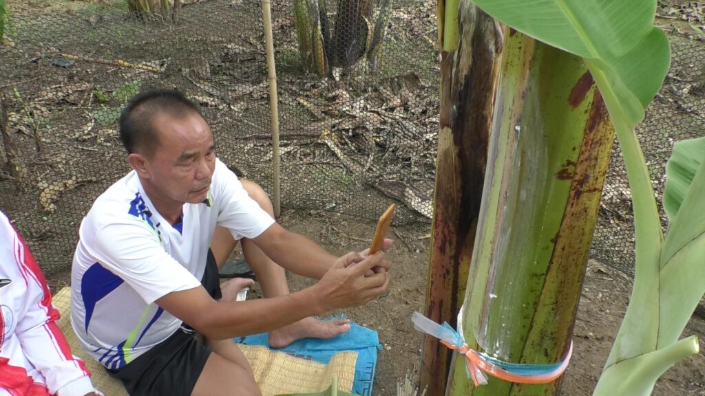 จากการสอบถาม นายเวียน พลมะนะ อายุ 67 ปี เล่าว่า ตนเองมีอาชีพทำสวน ได้ปลูกกล้วยไว้หลายต้น ซึ่งที่ผ่านมาก็ไม่พบสิ่งผิดปกติ แต่คราวนี้ กลับพบว่ากล้วยได้ออกหัวปลีและผลกล้วยที่โคนต้น นับได้มี 8 หวี 14 ลูก ซึ่งตรงกับธูปเสี่ยงทาย โดยก่อนเจอกล้วยประหลาด ตอนเช้าหลังกินข้าวเสร็จ ตัวเองก็มาตัดหญ้า ในสวน ก็กลับพบปลีกล้วยแปลกๆ เชื่อว่าจะมาให้โชคลาภแน่นอน จึงกราบไหว้เจ้าที่เจ้าที่ ขอให้ลูกหลานถูกหวย ได้เงินได้ทอง จากนั้นก็ไปบอกภรรยาและเพื่อนบ้าน ต่างพากันมาดูและขอเลขเด็ด